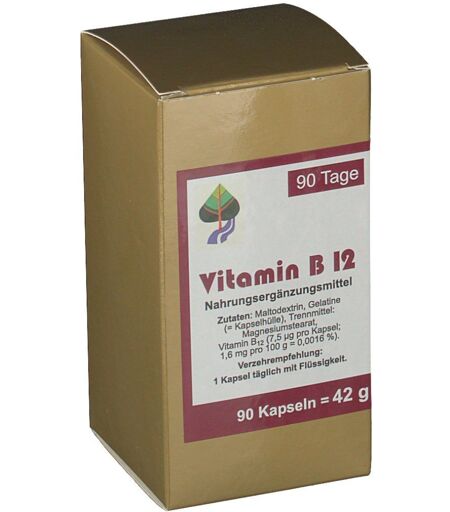 Nahrungsergänzungsmittel sind kein Ersatz für eine ausgewogene und abwechslungsreiche Ernährung und eine gesunde Lebensweise. Vitamin B12Zutaten:Matodextrin, Gelatine (=Kapselhülle), Trennmittel: Magnesiumstearat, Vitamin B12 (7,5 µg pro Kapsel; 1,6 mg pro 100 g = 0,0016 %).Eine Kapsel enthält 300 % der empfohlenen täglichen Verzehrmenge für einen Erwachsenen an Vitamin B12.Verzehrempfehlung: Eine Kapsel täglich mit Flüssigkeit.Hinweis: Die angegebene empfohlene Tagesmenge darf nicht überschritten werden. Aufbewahrung: Kühl (6-25 °C) und lichtgeschützt lagern. Außerhalb der Reichweite von kleinen Kindern aufbewahren. Nettofüllmenge90 Kapseln = 42 gHerstellerAalborg Pharma GmbHA-1030 Wien ...
