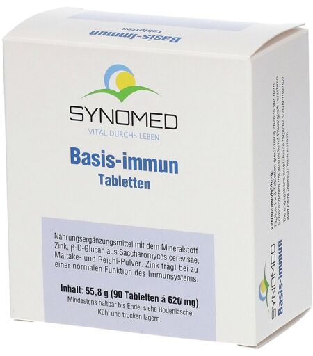 Nahrungsergänzungsmittel sind kein Ersatz für eine ausgewogene und abwechslungsreiche Ernährung und eine gesunde Lebensweise. Basis-immun Tabletten Nahrungsergänzungsmittel mit dem Mineralstoff Zink, ß-D-Glucan aus Saccharomyces cerevisae, Maitake- und Reishi- Pulver. Zink trägt bei zu einer normalen Funktion des Immunsystems. Zutaten: (1,3)-(1,6)-ß-D-Glucan aus Saccharomyces cerevisae, Füllstoff Mikrokristalline Cellulose, Reishi-Pulver, Maitake-Pulver, Zinkgluconat, Füllstoff Cellulosepulver,Trennmittel Magnesiumsalze der Speisefettsäuren (pflanzlich), Überzugsmittel Schellack, Füllstoff Siliciumdioxid. Ohne Lactose, Farbstoffe oder Konservierungsstoffe. ß-D-Glucan aus Bierhefe (glutenfrei). Nährwertangaben: Tagesverzehrsmenge (= 3 Tabletten) enthält: (1,3)-(1-6)-ß-D-Glucan aus Saccharomyces cerevisae 1.050 mg (**) Maitake-Pulver 220 mg (**) Reishi-Pulver 220 mg (**) Zink 10 mg (100%*) *Referenzmenge nach LMIV (NRV) **Keine Empfehlung der LMIV vorhanden. Verzehrempfehlung: Täglich 1 x 3 Tabletten gleichzeitig abends vor dem Schlafengehen mit ausreichend Flüssigkeit verzehren. Hinweis: Die angegebene empfohlene Tagesmenge darf nicht überschritten werden. Aufbewahrung: Kühl (6-25 °C) und lichtgeschützt lagern. Außerhalb der Reichweite von kleinen Kindern aufbewahren. Nettofüllmenge: 90 Tabletten = 55,8 g HerstellerSynomed GmbHFlamweg 132-13425335 Elmshorn ...