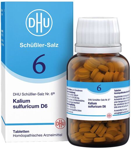 DHU Schüßler-Salz Nr. 6 ist ein homöopathisches Arzneimittel. Die Anwendung erfolgt ausschließlich aufgrund der langjährigen Verwendung in dieser Therapie. DHU Schüßler-Salz Nr. 6® Kalium sulfuricum D3 [D6, D12] Anwendungsgebiete: Registriertes homöopathisches Arzneimittel, daher ohne Angabe einer therapeutischen Indikation. Zu Risiken und Nebenwirkungen lesen Sie die Packungsbeilage und fragen Sie Ihren Arzt oder Apotheker. Enthält Lactose und Weizenstärke. Packungsbeilage beachten! Deutsche Homöopathie-Union DHU-Arzneimittel GmbH & Co. KG, Karlsruhe ...