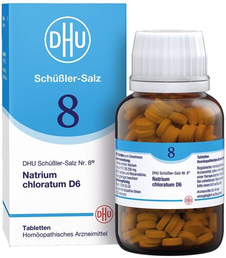DHU Schüßler-Salz Nr. 8 ist ein homöopathisches Arzneimittel. Die Anwendung erfolgt ausschließlich aufgrund der langjährigen Verwendung in dieser Therapie. DHU Schüßler-Salz Nr. 8® Natrium chloratum D3 [D6, D12] Anwendungsgebiete: Registriertes homöopathisches Arzneimittel, daher ohne Angabe einer therapeutischen Indikation. Zu Risiken und Nebenwirkungen lesen Sie die Packungsbeilage und fragen Sie Ihren Arzt oder Apotheker. Enthält Lactose und Weizenstärke. Packungsbeilage beachten! Deutsche Homöopathie-Union DHU-Arzneimittel GmbH & Co. KG, Karlsruhe ...
