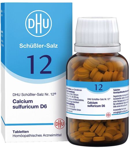 DHU Schüßler-Salz Nr. 12 ist ein homöopathisches Arzneimittel. Die Anwendung erfolgt ausschließlich aufgrund der langjährigen Verwendung in dieser Therapie. DHU Schüßler-Salz Nr. 12® Calcium sulfuricum D3 [D6, D12] Anwendungsgebiete: Registriertes homöopathisches Arzneimittel, daher ohne Angabe einer therapeutischen Indikation. Zu Risiken und Nebenwirkungen lesen Sie die Packungsbeilage und fragen Sie Ihren Arzt oder Apotheker. Enthält Lactose und Weizenstärke. Packungsbeilage beachten! Deutsche Homöopathie-Union DHU-Arzneimittel GmbH & Co. KG, Karlsruhe ...