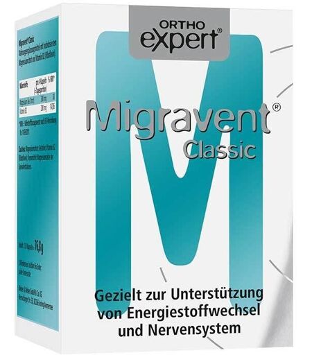 Nahrungsergänzungsmittel sind kein Ersatz für eine ausgewogene und abwechslungsreiche Ernährung und eine gesunde Lebensweise.Migravent® ClassicNahrungsergänzungsmittel mit hochdosiertem Magnesiumcitrat und Vitamin B2 (Riboflavin).Gezielt zur Unterstützung von Energiestoffwechsel und Nervensystem. Die beiden Mikronährstoffe Vitamin B2 (Riboflavin) und Magnesium tragen zur normalen Funktion des Energiestoffwechsels und des Nervensystems, z.B. des Gehirns, bei. Bei einem Defizit an diesen beiden Mikronährstoffen werden Energiestoffwechsel und Nerven- system gestört. Die Einnahme der hochdosierten Kombination von Riboflavin und Magnesium in Migravent® Classic gleicht dieses Defizit aus.Riboflavin trägt zu einem norma- len Energiestoffwechsel in den Zellkraftwerken bei.Magnesium spielt ebenfalls eine wichtige Rolle im Energiestoffwechsel. Es ist an der Aktivierung von über 300 Enzymen beteiligt. Der Mineralstoff ist wichtig für die Nerven- und Muskelfunktion.Unsere Orthoexpert®- Produkte Unterstützung bei Migräne, Gelenkgesundheit, Immunsystem, Leistungsfähigkeit, Herz & Kreislauf, Männergesundheit, Wechseljahre – wo immer Sie Ihren Körper durch gezielt ausgewählte Mikronährstoffe unterstützen möchten, Orthoexpert® bietet eine sinnvolle, hochdosierte Mikronährstoff-Kombination für Sie an. Jede einzelne, spezielle Zusam- mensetzung leistet einen wichtigen Beitrag zur Gesunderhaltung Ihres Organismus.Zutaten: Magnesiumcitrat; Überzugsmittel: Hydroxypropylmethylcellulose; Vitamin B2 (Riboflavin); Trennmittel: Magnesiumsalze der SpeisefettsäurenNährwerte: Durchschnittliche Nährwerte pro4 Kapseln% empf. Tagesdosis*Magnesium (als Citrat)300 mg80 Vitamin B2200 mg14286*nach Nährwert-KennzeichnungsverordnungVerzehrempfehlung:2 x 2 Kapseln pro Tag einnehmen. Hinweis:Die empfohlene tägliche Verzehrsmenge darf nicht überschritten werden. Aufbewahrung: Außerhalb der Reichweite von kleinen Kindern lagern!Nettofüllmenge:120 Kapseln = 76,8 gHersteller:Weber &Weber GmbH & Co. KGHerrschinger Str. 3382266 Inning/Ammersee ...