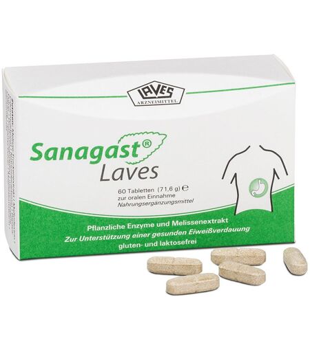 Nahrungsergänzungsmittel sind kein Ersatz für eine ausgewogene und abwechslungsreiche Ernährung und eine gesunde Lebensweise. Sanagast® Laves enthält proteolytische Enzyme aus der Ananas und Papaya mit einer hohen Aktivität (500 FIP/Tablette) kombiniert mit Melissenextrakt, der seit Jahrtausenden als magenberuhigend und verdauungsfördernd gilt. Die aus der Papaya und der Ananas gewonnenen Enzyme werden zur Unterstützung des Eiweissabbaus im Magen eingesetzt. Dabei enthält Sanagast® Laves eine spezielle pH-Wert stabilisierende Formulierung mit Carbonaten um die Enzyme in ihrer Aktivität in der Wirkung optimal zu schützen. Auf diese Weise wird die natürliche Magenfunktion unterstützt - auch bei einem nervösen oder überlasteten Magen. Sanagast® Laves enthält keine Laktose, Gluten oder Konservierungsmittel laut Gesetz. Sanagast® Laves enthält pro Tablette 240 mg Melissenextrakt (Melissa officinalis-Blätter) je 200 mg Calciumcarbonat und Natriumbicarbonat 188 mg Papaya (Carica papaya) 84 mg Ananas (Ananas comosus) mit proteolytischer Aktivität von 500 FIPZutaten:Melisse-Trockenextrakt (19 %), Maltodextrin, Calciumcarbonat, Natriumbicarbonat, Papaya-Pulver (15 %), Dicalciumphosphat, microcristalline Cellulose, Ananas-Pulver (7 %), Magnesiumstearat, Siliciumdioxid. Kann Spuren von Sulfiten enthalten.Nährwerte: Durchschnittliche Nährwerte: pro 1 Tablette Brennwert 1,75 kcal / 7,3 k Kohlenhydrate 0,35 g Eiweiß 0,10 g Fett 0,004 g Melissenextrakt 240 mg Papayapulver 188 mg Ananaspulver 84 mg Verzehrempfehlung:1-3 Tabletten mit etwas Flüssigkeit zu einer Mahlzeit einnehmen.Hinweis:Die angegebene Tagesverzehrmenge darf nicht überschritten werden.Aufbewahrung: Kühl (6-25 °C) und lichtgeschützt lagern. Nach dem Öffnen innerhalb von 3 Monaten aufbrauchen.Nettofüllmenge:60 TablettenHersteller: Laves-Arzneimittel GmbH & Co. Verwaltungs-KG Barbarastraße 14 30952 Ronnenberg ...
