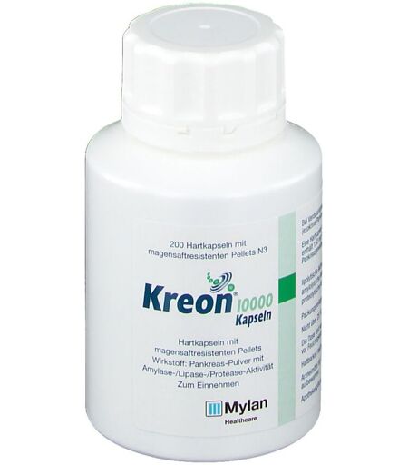 Wirkstoff: PankreatinZur Anwendung bei Kindern und Erwachsenen. Was sind Kreon® 10 000 Kapseln und wofür werden sie angewendet?Kreon® 10 000 Kapseln sind ein Arzneimittel zum Ersatz von Verdauungsenzymen der Bauchspeicheldrüse (Pankreasenzyme).Kreon® 10 000 Kapseln werden angewendet bei Verdauungsstörungen (Maldigestion) infolge ungenügender oder fehlender Funktion der Bauchspeicheldrüse (exokrine Pankreasinsuffi zienz). Mukoviszidose zur Unterstützung der ungenügenden Funktion der Bauchspeicheldrüse. Was müssen Sie vor der Einnahme von Kreon® 10 000 Kapseln beachten?Kreon® 10 000 Kapseln dürfen nicht eingenommen werden, bei nachgewiesener Überempfindlichkeit gegen Schweinefleisch (Schweinefleischallergie) oder einen anderen Bestandteil von Kreon® 10 000 Kapseln. während der stark entwickelten Erkrankungsphase einer akuten Bauchspeicheldrüsenentzündung und bei akuten Schüben einer chronischen Bauchspeicheldrüsenentzündung. Die Einnahme von Kreon® 10 000 Kapseln kann jedoch dann sinnvoll sein, wenn beim Abklingen eines akuten Entzündungsschubes während der diätetischen Aufbauphase weiterhin eine Verdauungsstörung besteht.Besondere Vorsicht bei der Einnahme von Kreon® 10 000 Kapseln ist erforderlich, da Kreon® 10 000 Kapseln aktive Enzyme enthalten, die bei Freisetzung im Mund, z.B. durch Zerkauen der in den Kapseln enthaltenen magensaftresistenten Pellets, dort zu Schleimhautschädigungen (z. B. Geschwürbildungen der Mundschleimhaut) führen können. Es ist deshalb darauf zu achten, dass die Kreon® 10 000 Kapseln oder beim Öffnen der Kapseln die Pellets unzerkaut geschluckt werden (siehe 3. Wie sind Kreon® 10 000 Kapseln einzunehmen?”). bei Darmverengungen (intestinale Obstruktionen), die bei Patienten mit Mukoviszidose (angeborene Stoffwechselstörung) bekannte Komplikationen sind. Beim Vorliegen von Darmverschluss-ähnlichen Krankheitszeichen sollte daher auch die Möglichkeit von Darmverengungen in Betracht gezogen werden. Bei Einnahme von Kreon® 10 000 Kapseln mit anderen Arzneimitteln:Es sind keine Arzneimittel bekannt, welche die Wirkung von Kreon® 10 000 Kapseln beeinflussen oder selbst in ihrer Wirkung beeinflusst werden.Schwangerschaft und Stillzeit:Es liegen keine ausreichenden Erfahrungen mit einer Anwendung von Kreon® 10 000 Kapseln bei schwangeren Frauen vor. Es liegen nur unzureichende Daten aus tierexperimentellen Studien in Bezug auf Schwangerschaft, Entwicklung des ungeborenen Kindes, Entbindung und Entwicklung des Kindes nach der Geburt vor. Das mögliche Risiko für den Menschen ist nicht bekannt. Wenn Sie schwanger sind oder wenn Sie stillen, sollten Sie Kreon® 10 000 Kapseln nicht einnehmen, es sei denn, Ihr behandelnder Arzt hält die Einnahme für unbedingterforderlich.Verkehrstüchtigkeit und das Bedienen von Maschinen:Durch die Einnahme von Kreon® 10 000 Kapseln werden das Reaktions- und Wahrnehmungsvermögen sowie die Urteilskraft nicht beeinflusst, so dass keine Auswirkungen auf das Führen eines Kraftfahrzeuges oder die Bedienung... ...
