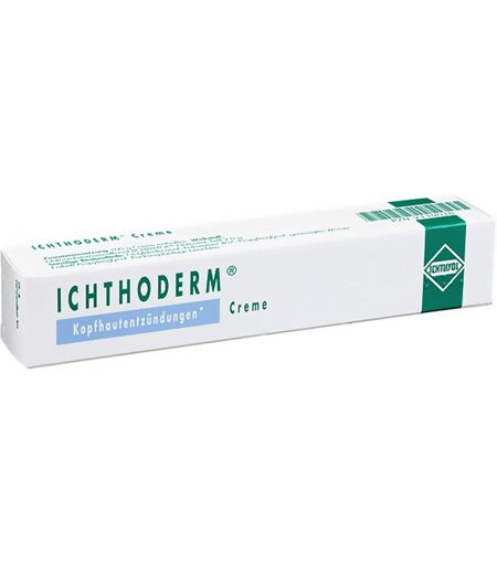 ICHTHODERM® Creme - Kortisonfreie Therapie bei Psoriasis capitis, auch für Säuglinge und Kinder geeignetICHTHODERM® Creme enthält Natriumbituminosulfonat (ICHTHYOL®-Natrium), hell 2% und ist auch zugelassen für Säuglinge und Kinder.antiphlogistisch antipruriginös antientzündlich reduziert Schuppenbildung geruchs- und farbneutral gut auswaschbar gut verträglich sparsam in der Anwendung durch eingebauten Applikator Anwendung: anfangs mehrmals wöchentlich, später 1 x wöchentlichAnwendungsgebieteICHTHODERM® Creme wird zur Behandlung der krankhaften Talgdrüsenüberproduktion der Kopfhaut (Seborrhoea oleosa und sicca), Schuppenbildung, Schuppenflechte (Psoriasis), Juckflechte (Ekzem), Hautjuckreiz (Pruritus) und Haarbalgentzündung (Follikulitis) im Bereich des behaarten Kopfes angewendet.WirkstoffeICHTHODERM® Creme enthält den Wirkstoff Natriumbituminosulfonat, hell.In 100 g Creme sind 2,0 g Natriumbituminosulfonat (ICHTHYOL®-Natrium), hell enthalten.Die sonstigen Bestandteile sind: Octyldodecanol, Poloxamer 407, Propylenglycol und gereinigtes Wasser.Zum Auftragen auf die Kopfhaut.Falls nicht anders verordnet, sollte ICHTHODERM® Creme in den ersten beiden Wochen mehrmals angewendet werden. Mit fortschreitendem Rückgang der Erkrankung genügt zumeist eine einmalige wöchentliche Anwendung.Die Häufigkeit der Anwendung von ICHTHODERM® Creme richtet sich nach dem Krankheitsbild und dem Wiederauftreten von Schuppen und Juckreiz. Die Haare und die Kopfhaut werden gut mit Wasser angefeuchtet. Für jede Kopfhautstelle wird ein 2 bis 3 Zentimeter langer Strang ICHTHODERM® Creme direkt mit dem Applikator auf die erkrankte Kopfhaut gegeben und mit den Fingerspitzen leicht einmassiert ICHTHODERM® Creme sollte mindestens 2-3 Minuten einwirken. Der direkte Kontakt der Creme mit den Augen sollte vermieden werden. Haare und Kopfhaut mit warmem Wasser gründlich spülen. ICHTHODERM® Creme erneut auf die Kopfhautstellen auftragen und einmassieren. Die Einwirkzeit sollte mindestens 5 Minuten betragen. Bei Bedarf kann die Einwirkzeit auch auf mehrere Stunden ausgedehnt werden.Auf Anweisung des behandelnden Arztes kann die Creme auch einmalig aufgetragen werden und über Nacht einwirken. Anschließend den Kopf mit einem handelsüblichen Shampoo waschen und erneut mit warmem Wasser gründlich spülen.Die Anwendungsdauer richtet sich nach dem Behandlungserfolg. ...