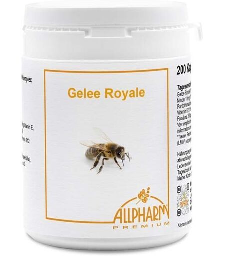 Nahrungsergänzungsmittel sind kein Ersatz für eine usgewogene und abwechslungsreiche Ernährung und eine gesunde Lebensweise.Gelee RoyaleGelee Royale wird von den Ammenbienen in deren Kopfdrüsen erzeugt und gilt in Imkerkreisen seit langem als Nahrungsergänzung zur Erhaltung der körperlichen und geistigen Leistungsfähigkeit, Ausdauer und Konzentration.Zutaten: Gelee Royale, Gelatine (Kapselhülle), Vitamin C, Niacin, Vitamin E, Pantothensäure, Vitamine: B1, B2, B6, B12, Folsäure, Biotin, Trennmittel Magnesiumsalze von Speisefettsäuren, Farbstoff .Nährwerte: Nährwert pro Kapsel Gelèe Royale 170 mg Vitamin C 60 mg Niacin 18 mg Vitamin E 10 mg Pantothensäure 6 mg Vitamin B6 2 mg Vitamin B2 1,6 mg Vitamin B1 1,4 mg Folsäure 200 µg Vitamin B12 1 µg Verzehrempfehlung: Täglich 1 Kapsel mit etwas Flüssigkeit einnehmen. Hinweis:Die angegebene empfohlene tägliche Verzehrmenge darf nicht überschritten werden.Aufbewahrung: Kühl (6-25 °C) und lichtgeschützt lagern. Außerhalb der Reichweite von kleinen Kindern aufbewahren.Nettofüllmenge: 200 Kapseln = 81,6 gHersteller: Allpharm Vertriebs-GmbH Langgasse 63 64409 Messel ...