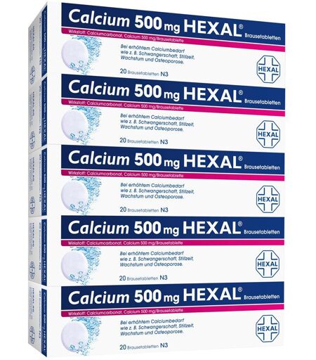 Unsere Argumente:Schnell lösliche Brausetablette Guter Geschmack Zuckerfrei und ohne FarbstoffAnwendungsgebiete:Vorbeugung eines Calciummangels bei erhöhtem Bedarf (z. B. Wachstumsalter, Schwangerschaft, Stillzeit) Unterstützende Behandlung der OsteoporoseWas ist Calcium 500 mg HEXAL® und wofür wird es angewendet?Calcium 500 mg HEXAL® ist ein Mineralstoffpräparat.Calcium 500 mg HEXAL® wird angewendetzur Vorbeugung eines Calciummangels bei erhöhtem Bedarf (z. B. Wachstumsalter, Schwangerschaft, Stillzeit) zur unterstützenden Behandlung der Osteoporose.Was müssen Sie vor der Einnahme von Calcium 500 mg HEXAL® beachten?Calcium 500 mg HEXAL® darf nicht eingenommen werdenwenn Sie überempfindlich (allergisch) gegen Calciumcarbonat oder einen der sonstigen Bestandteile von Calcium 500 mg HEXAL® sind bei zu hohen Calciumkonzentrationen im Blut oder im Urin bei längerer Ruhigstellung von Gliedmaßen (Immobilisation) bei calciumhaltigen Nierensteinen oder Verkalkung der Niere. Besondere Vorsicht bei der Einnahme von Calcium 500 mg HEXAL® ist erforderlich bei eingeschränkter Nierenfunktion bei erniedrigter Phosphatkonzentration im Blut (Hypophosphatämie).Fragen Sie Ihren Arzt auch um Rat, wenn in Ihrer Familie calciumhaltige Nierensteine vorgekommen sind.Durch die Einnahme von Calcium 500 mg HEXAL® erhöht sich die Ausscheidung von Calcium im Urin. In den ersten Monaten nach Einnahmebeginn wird dadurch auch die Neigung zur Ausfällung von Calciumsalzen und unter Umständen zur Bildung von Steinen in Niere und Harnblase gesteigert. Dies kann durch eine reichliche Zufuhr von Flüssigkeit vermieden werden.Bei Niereninsuffizienz sollte Calcium 500 mg HEXAL® nur unter laufender Überwachung der Calcium- und Phosphatkonzentrationen im Blut und Urin angewendet werden. Während einer Therapie mit hohen Dosen Calcium 500 mg HEXAL®, insbesondere wenn zusätzlich mit Vitamin D therapiert wird, besteht die Gefahr einer Hyperkalzämie, der eine Störung der Nierenfunktion folgen kann. Bei solchenPatienten sollten der Serumcalciumspiegel und die Nierenfunktion überwacht werden.Bei Einnahme von Calcium 500 mg HEXAL® mit anderen ArzneimittelnBitte informieren Sie Ihren Arzt oder Apotheker, wenn Sie andere Arzneimittel einnehmen/anwenden bzw. vor kurzem eingenommen/angewendet haben, auch wenn es sich um nicht verschreibungspflichtige Arzneimittel handelt.Vitamin D steigert die Wirkung von Calcium 500 mg HEXAL® (Resorptionssteigerung).Bestimmte harntreibende Mittel (Diuretika vom Thiazid- Typ) vermindern die Calciumausscheidung. Bei gleichzeitiger Einnahme von Calcium 500 mg HEXAL® und solchen Arzneimitteln sollte deshalb der Serumcalciumspiegel regelmäßig überwacht werden.Wenn durch die Einnahme von Calcium 500 mg HEXAL® der Calciumblutspiegel steigt, wird die Empfindlichkeit gegenüber bestimmten Arzneimitteln, die die Herzkraft steigern (herzwirksame Glykoside), erhöht und das Risiko von Herzrhythmusstörungen gesteigert. Patienten unter gleichzeitiger Behandlung mit herzwirksamen... ...