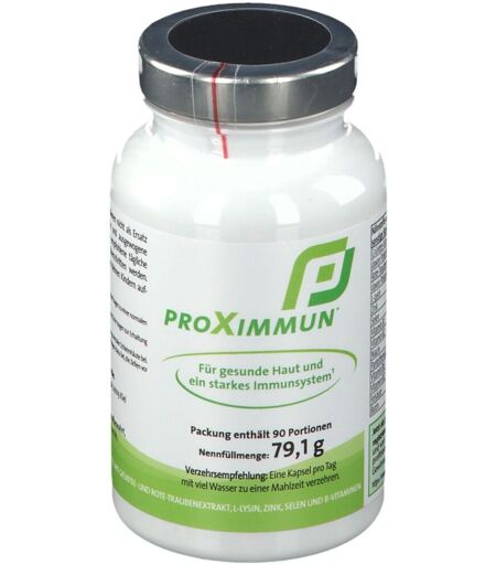 Sollte nicht konsumiert werden, wenn Sie am selben Tag andere Produkte konsumieren, die grünen Tee enthalten. Sollte nicht von schwangeren oder stillenden Frauen und Kindern unter 18 Jahren konsumiert werden.Sollte nicht auf nüchternen Magen konsumiert werdenNahrungsergänzungsmittel sind kein Ersatz für eine ausgewogene und abwechslungsreiche Ernährung und eine gesunde Lebensweise. Nahrungsergänzungsmittel mit Grüntee-Extrakt, Rote-Traubenextrakt, L-Lysin, Zink, Selen und B-VitaminkomplexMit proXimmun™ tragen Sie zu einer normalen Funktion Ihres Immunsystems sowie zur Erhaltung normaler Haut und Schleimhäute bei.proXimmun™ ist eine einzigartige Kombination aus Pflanzenextrakten, Vitaminen und Spurenelementen. Es wurde entwickelt, um mögliche Lücken im Immunsystem zu schließen. Die Vitalstoffe in proXimmun™ sind eine ideale Ergänzung der täglichen Nahrung, um einen erhöhten Bedarf an Mikronährstoffen zu decken.Die Lebensfunktionen des menschlichen Körpers werden durch ein funktionierendes Immunsystem aufrecht erhalten. Nur ein intaktes Immunsystem besteht den ständigen Kampf gegen pathogene Bakterien und Viren.Vorteile von proXimmun™Durch den hohen Anteil an Pflanzenextrakten enthält proXimmun™ viele natürliche Vitamine und Spurenelemente, die sich auf diese Weise durch eine hohe Bioverfügbarkeit auszeichnen. Es ist gezielt angereichert mit den lebenswichtigen Spurenelementen Zink und Selen, die unser Körper nur durch die Nahrung aufnehmen kann. Sämtliche B-Vitamine sind zusätzlich in der empfohlenen Tagesdosis der Deutschen Gesellschaft für Ernährung (DGE) in den Kapseln enthalten. Diese Vitamine stehen auf der Liste der Vitamine, die laut der DGE sinnvoller Weise durch Nahrungsergänzung der täglichen Nahrung hinzugefügt werden sollten. nur 1 Kapsel täglich versorgt den Körper mit allen angegebenen Vitalstoffen. Zutaten:Grüner Tee-Extrakt (50 % Polyphenole), Rote-Traubenextrakt (28 % Polyphenole) (enthält Schwefeldioxid), L-Lysin HCl, Hydroxypropylmethylcellulose (Kapselhülle), Zinkglukonat, Natriumselenit in Calciumcarbonat, Nicotinsäureamid, Calcium-D-pantothenat, Cyanocobalamin auf Mannit, Pyridoxin HCl, Thiamin HCl, Riboflavin, Folsäure, BiotinNährwertepro Tagesportion 1 Kapselpro 100 gEnergie8 kJ/ 1,8 kcal878 kJ/ 209 kcalFett ...