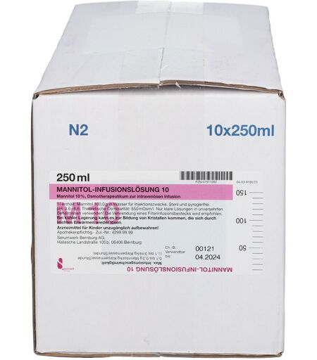 Mannitol-Infusionslösung 10Zusammensetzung: 1 l enthält: Wirkstoffe: Mannitol 100 g. Sonstige Bestandteile: Wasser für Injektionszweck.Anwendungsgebiete: Therapie und Prophylaxe eines akuten Nierenversagens infolge Trauma oder Schock nach vorangegangener Probeinfusion, Hirndrucksenkung bei intakter Blut-Hirn-Schranke, Osmotherapie zur Hirnödemprophylaxe und -therapie, Glaukom. Gegenanzeigen:O ligurie/Anurie nach Probeinfusion, kardiale Dekompensation, Dehydratationszustände, Hyperhydratation, Lungenödem, intrakranielle Blutungen, Abflusshindernis im Bereich der ableitendenHarnwege, erhöhte Serumosmolarität. Schwangerschaft: Es besteht das Risiko der Überdosierung nach Infusion großer Mengen Mannitol-Lösung infolge Überlastung der Nieren in der Spätschwangerschaft. Nebenwirkungen: Nach schneller Infusion können Übelkeit, Erbrechen, Oberbauchschmerzen, Kopfschmerzen, Verwirrtheitszustände, Krämpfe sowie Tachykardien auftreten. An der Injektionsstelle kann eine Thrombophlebitis entstehen. Vor Beginn einer Osmotherapie mit Mannitol ist ein Nierenversagen infolge Flüssigkeits- bzw. Volumenmangels auszuschließen. Störungen im Wasserhaushalt mit Dehydratation. Störungen im Elektrolythaushalt mit starken Elektrolytverlusten. Ausbildung eines Lungenödems bei eingeschränkter Nierenfunktion. Akutes Nierenversagen. Überempfindlichkeitsreaktionen bis hin zum anaphylaktischen Schock. ...