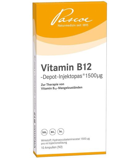 Was ist Vitamin B12-Depot-Injektopas® 1500 μg und wofür wird es angewendet? Vitamin B12-Depot-Injektopas® 1500 μg ist ein Vitaminpräparat. Anwendungsgebiete: Vitamin-B12-Mangel, der ernährungsmäßig nicht behoben werden kann. Wie ist Vitamin B12-Depot-Injektopas® 1500 μg anzuwenden? Nehmen Sie das Arzneimittel immer genau nach der Anweisung in der Packungsbeilage ein. Bitte fragen Sie bei Ihrem Verordner oder Apotheker nach, wenn Sie sich nicht ganz sicher sind. Soweit nicht anders verordnet: Zu Beginn der Behandlung wird in den ersten Wochen nach Diagnosestellung 1 ml Vitamin B12-Depot-Injektopas® 1500 μg zweimal pro Woche verabreicht (entsprechend 3000 μg Hydroxocobalaminacetat). Bei nachgewiesener Vitamin-B12-Aufnahmestörung im Darm werden anschließend 100 μg Cyanocobalamin/ Hydroxocobalamin/Hydroxocobalaminacetat einmal im Monat verabreicht. Vitamin B12-Depot-Injektopas® 1500 μg wird in der Regel intramuskulär verabreicht (in einen Muskel eingespritzt). Es kann aber auch langsam intravenös oder subkutan gegeben (in eine Vene oder unter die Haut gespritzt) werden. Vitamin B12-Depot-Injektopas® 1500 μg ist zur längeren Anwendung bestimmt. Befragen Sie hierzu bitte Ihren Arzt. Was Vitamin B12-Depot-Injektopas® 1500 μg enthält: Der Wirkstoff ist: 1 Ampulle mit 1 ml Injektionslösung enthält: Hydroxocobalaminacetat 1500 μg. Hinweis: Hydroxocobalaminacetat gehört zur Gruppe der Stoffe, die zusammenfassend als “Vitamin B12“ bezeichnet werden. Die sonstigen Bestandteile sind: Natriumchlorid, Wasser für Injektionszwecke. Nettofüllmenge: 10 x 1 ml Ampullen ...