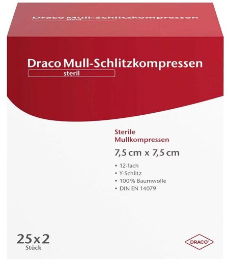 Draco Schlitzkompressen Mull 7,5x7,5 cm steril 12fach 25x2 St Kompressen