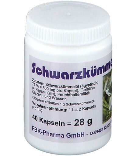 Nahrungsergänzungsmittel sind kein Ersatz für eine ausgewogene und abwechslungsreiche Ernährung und eine gesunde Lebensweise. Nahrungsergänzungsmittel mit Nachtkerze und Vitamin E.ZutatenSchwarzkümmelöl (ägyptisch, (71% = 500 mg pro Kapsel), Gelatine (=Kapselhülle), Feuchthaltemittel: Glyzerin und Wasser.2 Kaspeln enthalten:1 g Schwarzkümmelöl.Verzehrempfehlung:1-2 Kapseln am Tag.Hinweis:Die täglich empfohlene Verzehrmenge darf nicht überschritten werden. Lagerungshinweis:Außerhalb der Reichweite von kleinen Kindern aufbewahren. Nettofüllmenge40 Kapseln = 28 g Hersteller FBK-Pharma GmbH Annaberger Str. 4009484 Kurort Oberwiesenthal ...