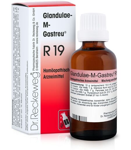Was ist Glandulae-M-Gastreu® R 19 und wofür wird es angewendet?Glandulae-M-Gastreu® R19 ist ein registriertes homöopathisches Arzneimittel, daher ohne Angabe einer therapeutischen Indikation. Hinweis: Bei während der Anwendung des Arzneimittels fortdauernden Krankheitssymptomen ist medizinischer Rat einzuholen.Wie ist Glandulae-M-Gastreu® R 19 anzuwenden?Nehmen Sie Glandulae-M-Gastreu® R19 immer genau nach der Anweisung in dieser Packungsbeilage ein. Bitte fragen Sie bei Ihrem Arzt oder Apotheker nach, wenn Sie sich nicht ganz sicher sind. Soweit nicht anders verordnet gilt für Erwachsene:Bei akuten Zuständen alle halbe bis ganze Stunde, höchstens 6-mal täglich, je 5 Tropfen einnehmen. Eine über eine Woche hinausgehende Anwendung sollte nur nach Rücksprache mit einem homöopathisch erfahrenen Therapeuten erfolgen. Bei chronischen Verlaufsformen 1- bis 3-mal täglich je 5 Tropfen einnehmen. Bei Besserung ist die Häufigkeit der Anwendung zu reduzieren.Dauer der Anwendung: Auch homöopathische Arzneimittel sollten ohne ärztlichen Rat nicht über längere Zeit eingenommen werden. Wenn Sie weitere Fragen zur Anwendung des Arzneimittels haben, fragen SIe Ihren Arzt oder Apotheker.Das Arzneimittel Glandulae-M-Gastreu® R 19 enthält: 10 g enthalten: Wirkstoffe: Glandula suprarenalis (suis) D12 1 g, Glandula thymi (suis) D12 1 g, Hypophysis (suis) D12 1 g, Pancreas (suis) D12 1 g, Testis (suis) D12 1 g, Thyreoidinum (suis) D12 1 g. Enthält 37 Vol.-% Alkohol. ...