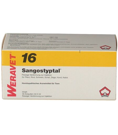 Weravet® 16 Sangostyptal® Flüssige Verdünnung zur Injektion für Pferd, Rind, Schwein, Schaf, Ziege, Hund und Katze. Die Anwendungsgebiete entsprechen dem veterinär-homöopathischen Arzneimittelbild, dazu gehören Blutstilllungsmittel bei venösen arteriellen Blutungen und Blutmelken Wartezeit: Pferd, Rind, Schaf und Ziege: Essbare Gewebe 8 Tage, Milch 0 Tage. Schwein: Essbare Gewebe 0 tage. Anwendung: Die Anwendung sollte nicht ohne tierärztlichen Rat erfolgen und ersetzt nicht andere vom Tierarzt diesbezüglich verordnete Arzneimittel und Maßnahmen. Zusammensetzung: Hamamelis virginiana C30, Achillea millefolium C30. ...