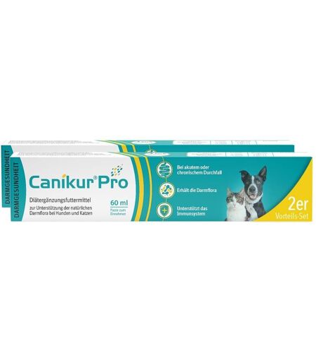 Canikur®Pro – Das clever kombinierte Diät-Ergänzungsfuttermittel für Hunde und Katzen zur Stabilisierung der physiologischen Verdauung bei Gefahr von, während oder nach Verdauungsstörungen in Stressphasen oder bei Futtermittelumstellung während und nach Medikamentengabe (z.B. Antibiotika) Als praktische Paste leicht zu füttern schmeckt Hunden und Katzen gut passt in jede Reiseapotheke 3-fach-kombiniert Probiotikum (E. faecium): dient dem Schutz der Darmwand und Stärkung des Immunsystems Präbiotikum (Bio-Mos®-C): fördert das Wachstum und die Aktivität bestimmter, für die Darmflora günstiger Bakterienarten Adsorbens (Bentonit): bindet durch seine Oberflächenstruktur Giftstoffe und Viren/Bakterien, die sich negativ auf die Darmflora auswirken können Canikur®Pro – zur Unterstützung der natürlichen Darmflora – Diät-Ergänzungsfuttermittel für Hunde und Katzen Canikur®Pro ist ein pro- und präbiotisches Diät-Ergänzungsfuttermittel für Hunde und Katzen zur Regulation der physiologischen Verdauung. Es kann begleitend während und nach einer Durchfall-Therapie zur Unterstützung der Darmflora gegeben werden. Durchfall gehört leider zu den häufigsten Gründen, aus denen wir mit unseren Haustieren tierärztliche Hilfe suchen. Hat unser Hund oder unsere Katze Durchfall, wird gleichzeitig auch die Darmflora angegriffen. Umgekehrt führt eine veränderte Darmflora oftmals zu Durchfall. Ein Ungleichgewicht der Darmflora kann durch die Gabe eines Synbiotikums wieder ausbalanciert werden. Hundebesitzer haben Canikur®Pro getestet und empfehlen es zur begleitenden Gabe bei Darmproblemen weiter1 Mehr als 9 von 10 Hundebesitzern empfehlen Canikur®Pro weiter1 83 % der Tierhalter beurteilen die Gabe als sehr einfach und die Akzeptanz als hervorragend. Einfluss von Canikur®Pro auf das Mikrobiom durch Studie belegt2 Fazit: Mit einem Synbiotikum wie Canikur® Pro für Hunde können Sie die Darmgesundheit und das Gleichgewicht des Mikrobioms Ihres Hundes unterstützen. Fütterungsempfehlung Canikur®Pro Paste Canikur®Pro Paste kann entsprechend der angegebenen Dosierung 2 x täglich über das Futter oder direkt in das Maul des Hundes oder der Katze gegeben werden. Bei zusätzlicher Medikamentengabe Canikur®Pro immer erst 1 bis 2 Stunden später verabreichen. Tier / Gewicht 2 x täglich Hund bis 10 kg 2 ml Hund bis 25 kg 4 ml Hund bis 40 kg 6 ml Hund bis 60 kg 8 ml Hund > 60 kg 10 ml Katzen 1 - 2 ml Zusammensetzung Canikur®Pro Sojaöl inaktivierte Hefe Lupinenproteinmehl Glukose Natriumchlorid Dinatriumphosphat Sonnenblumenöl Inhaltsstoffe Canikur®Pro Rohöle und -fette 41,1 % Rohasche 21,1 % Gehalt an säureunlöslicher Asche 13,0 % Rohprotein 6,0 % Rohfaser 1,5 %. Zusatzstoffe Canikur®Pro Bentonit 1m558i: 16,5%. Zootechnische Zusatzstoffe: Enterococcus faecium (DSM 10663/NCIMB 10415): 2 x 1012 CFU/kg Die häufigsten Fragen und Antworten rund um Canikur®Pro Warum hat mein Hund/meine Katze Durchfall? Durchfall ist ein Symptom, für das es viele Ursachen gibt. Allen gemein ist, dass sie zu... ...