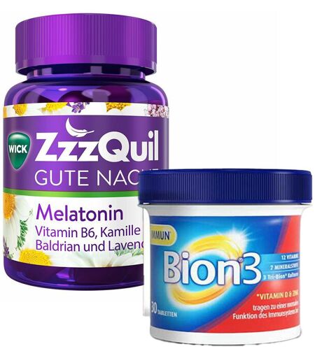 Nahrungsergänzungsmittel sind kein Ersatz für eine abwechslungsreiche und ausgewogene Ernährung und eine gesunde Lebensweise.WICK ZzzQuil Gute Nacht mit Melatonin Wenn man sich ausgeschlafen fühlt, ist man für Höchstleistungen bereit. Doch häufig lässt einen der Alltag abends nicht zur Ruhe kommen und einschlafen. Für diese Momente wurde die Einschlafhilfe WICK ZzzQuil Gute Nacht entwickelt: Innovative Weichgummis, die dir helfen schneller einzuschlafen und somit am nächsten Tag erholter aufzuwachen. Einschlafhilfe mit Melatonin ohne Gewöhnungseffekte oder Müdigkeit am nächsten Tag WICK ZzzQuil Gute Nacht enthält 1 mg Melatonin - ein Hormon, das auch auf natürliche Weise von unserem Körper als Schlafsignal gebildet wird und den Schlafrhythmus koordiniert. Das Hormon arbeitet mit unserer inneren Uhr zusammen und hilft uns schneller einzuschlafen, ohne dass es zu Müdigkeit am nächsten Tag führt. Es baut sich nach ca. 7 Stunden im Körper ab. WICK ZzzQuil Gute Nacht kann bei Bedarf eingenommen werden, ohne dass es zu einem Gewöhnungseffekt kommt. Täglich kann eines der innovativen Weichgummis eingenommen werden. Außerdem enthält jeder Weichgummi Pflanzenextrakte aus Baldrian, Lavendel und Kamille sowie das Vitamin B6. Vitamin B6 trägt zur Reduzierung von Müdigkeit und Erschöpfung bei. OHNE Gluten, Laktose sowie künstliche Farbstoffe, Aromen und Süßungsmittel oder Alkohol Die Weichgummis haben einen natürlichen Waldfrucht-Geschmack und sind frei von Gluten, Laktose sowie künstlichen Farbstoffen, Aromen und Süßungsmitteln oder Alkohol. Angenehme Einnahme Das innovative Weichgummi mit natürlichem Waldfruchtgeschmack ist besonders angenehm ohne Wasser einzunehmen - 30 Minuten vor dem Schlafengehen einfach im Mund zergehen lassen oder kauen. Angenehm schneller einschlafen mit WICK ZzzQuil Gute Nacht® mit Melatonin von der weltweiten Nr. 1** Schlaf-Marke ZzzQuil. * Melatonin trägt zu einer Verkürzung der Einschlafzeit bei. **IQVIA Global Database, quarterly database global Insights. Time period used: Calendar Year 2019. Exact scope OTC3 13A1 Calming & Sleeping Products Bion® 3 Immun Mit einer besonderen Kombination aus ausgewählten Vitaminen und Mineralstoffen wie Vitamin C,D & Zink in Verbindung mit Bakterien der Darmflora Liebst du es einen aktiven Lebensstil zu führen , unabhängig von den Herausforderungen des Tages ? Äußere Faktoren wie kalte Wintertemperaturen , Stress und Müdigkeit können das Immunsystem deines Körpers belasten , das eine Schlüsselfunktion dabei spielt , dich jeden Tag fit und gesund zu halten . Probiere doch mal Bion3 Immun* mit ausgewählten Nährstoffen zur Unterstützung der Abwehrkräfte und zur Verringerung von Müdigkeit** Bion3 Immun* wurde wissenschaftlich entwickelt und enthält eine besondere Kombination aus Bakterien der Darmflora mit Vitaminen und Mineralstoffen . Es enthält Vitamin C, D und Zink zur Unterstützung Deiner Abwehrkräfte 1 , Vitamin B6, Folsäure & B12 zur Verringerung von Müdigkeit und... ...