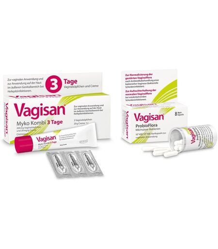 Vagisan ProbioFlora Milchsäure-Bakterien: + Vagisan Myko Kombi 3 Tage Dieses Set besteht aus: Vagisan ProbioFlora Milchsäure-Bakterien: Vaginalkapseln zum Aufbau der Scheidenflora und Wiederherstellung des natürlichen vaginalen pH-Werts Vagisan Myko Kombi 3 Tage: Vaginalzäpfchen und Creme zur Behandlung von Scheidenpilz Vagisan ProbioFlora Milchsäure-Bakterien: Vaginalkapseln zum Aufbau der Scheidenflora und Wiederherstellung des natürlichen vaginalen pH-Werts Vagisan ProbioFlora Milchsäure-Bakterien I Vaginalkapseln zur Vorbeugung wiederkehrender Scheideninfektionen I Aufbau und Stabilisierung einer gesunden Scheidenflora Das Produkt auf einen Blick: Zur Normalisierung der gestörten Scheidenflora nach Antibiotikabehandlung einer bakteriellen Vaginose Zur Aufrechterhaltung der normalen Vaginalflora bei wiederkehrenden Scheideninfektionen Zur Wiederherstellung eines abwehrstarken Scheidenmilieus enthält zwei hochwertige scheidentypische Milchsäurebakterien-Stämme (Lactobacillus gasseri DSM 14869 und Lactobacillus rhamnosus DSM 14870) einfaches Einführen in die Scheide ohne Applikator Keine Kühlschranklagerung notwendig Nach bakteriellen oder bei wiederkehrenden Scheideninfektionen ist es besonders wichtig, die Scheidenflora zu stärken und das natürliche Gleichgewicht wiederherzustellen, um erneuten Infektionen vorzubeugen. Das Präparat enthält dafür folgende lebende Mikroorganismen: Die Stämme L. gasseri DSM 14869 und L. rhamnosus DSM 14870. Die Laktobazillen vermehren sich angeregt durch die Scheidenflüssigkeit und besiedeln die Vagina. Das Besondere: Die enthaltenen Laktobazillenstämme produzieren im Scheidenmilieu Milchsäure aber auch Substanzen, die Keime abwehren. Hierdurch tragen sie zur Stabilisierung bzw. zum Wiederaufbau des physiologischen pH-Werts in der Scheide bei und zur natürlichen Abwehr von pathogenen Keimen. Dies unterstützt z. B. die Flora von Frauen, die zu wiederholten Scheideninfektionen neigen und bei denen der pH-Wert häufiger aus dem natürlichen Gleichgewicht gerät. Durch die Behandlung mit Vagisan® ProbioFlora Milchsäure-Bakterien Vaginalkapseln können weitere Scheideninfektionen vorgebeugt werden. Vagisan ProbioFlora Milchsäure-Bakterien sind frei von Konservierungsmitteln und Schweinegelatine. Dosierungsempfehlung: Nach der Antibiotikabehandlung einer bakteriellen Scheideninfektion: 6 bis 8 Tage lang abends vor dem Schlafengehen eine Vaginalkapsel in die Scheide einführen. Bei wiederkehrenden Scheideninfektionen: Direkt nach der Monatsblutung 4 bis 6 Tage lang abends eine Vaginalkapsel einführen. Anwendung: Führen Sie eine Vaginalkapsel täglich abends vor dem Schlafengehen tief in die Scheide ein. Nach dem Einführen in die Scheide löst sich die Kapsel dort auf. Die gefriergetrockneten Laktobazillen werden freigesetzt, nehmen Flüssigkeit aus der Scheide auf und erwachen“ wieder zum Leben. Pflichttext Vagisan ProbioFlora Milchsäure-Bakterien Zur Normalisierung der gestörten Vaginalflora nach Antibiotikabehandlung einer... ...