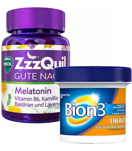 Nahrungsergänzungsmittel sind kein Ersatz für eine abwechslungsreiche und ausgewogene Ernährung und eine gesunde Lebensweise. WICK ZzzQuil Gute Nacht mit Melatonin + Bion® 3 Energy WICK ZzzQuil Gute Nacht mit Melatonin Wenn man sich ausgeschlafen fühlt, ist man für Höchstleistungen bereit. Doch häufig lässt einen der Alltag abends nicht zur Ruhe kommen und einschlafen. Für diese Momente wurde die Einschlafhilfe WICK ZzzQuil Gute Nacht entwickelt: Innovative Weichgummis, die dir helfen schneller einzuschlafen und somit am nächsten Tag erholter aufzuwachen. Einschlafhilfe mit Melatonin ohne Gewöhnungseffekte oder Müdigkeit am nächsten Tag WICK ZzzQuil Gute Nacht enthält 1 mg Melatonin - ein Hormon, das auch auf natürliche Weise von unserem Körper als Schlafsignal gebildet wird und den Schlafrhythmus koordiniert. Das Hormon arbeitet mit unserer inneren Uhr zusammen und hilft uns schneller einzuschlafen, ohne dass es zu Müdigkeit am nächsten Tag führt. Es baut sich nach ca. 7 Stunden im Körper ab. WICK ZzzQuil Gute Nacht kann bei Bedarf eingenommen werden, ohne dass es zu einem Gewöhnungseffekt kommt. Täglich kann eines der innovativen Weichgummis eingenommen werden. Außerdem enthält jeder Weichgummi Pflanzenextrakte aus Baldrian, Lavendel und Kamille sowie das Vitamin B6. Vitamin B6 trägt zur Reduzierung von Müdigkeit und Erschöpfung bei. OHNE Gluten, Laktose sowie künstliche Farbstoffe, Aromen und Süßungsmittel oder Alkohol Die Weichgummis haben einen natürlichen Waldfrucht-Geschmack und sind frei von Gluten, Laktose sowie künstlichen Farbstoffen, Aromen und Süßungsmitteln oder Alkohol. Angenehme Einnahme Das innovative Weichgummi mit natürlichem Waldfruchtgeschmack ist besonders angenehm ohne Wasser einzunehmen - 30 Minuten vor dem Schlafengehen einfach im Mund zergehen lassen oder kauen. Angenehm schneller einschlafen mit WICK ZzzQuil Gute Nacht® mit Melatonin von der weltweiten Nr. 1** Schlaf-Marke ZzzQuil. * Melatonin trägt zu einer Verkürzung der Einschlafzeit bei. **IQVIA Global Database, quarterly database global Insights. Time period used: Calendar Year 2019. Exact scope OTC3 13A1 Calming & Sleeping Products Bion® 3 Energy ENERGIE1 AUS DEM BAUCH HERAUS2: Multivitamin mit B2und Biotin zur Unterstützung des Darms2 und B12, B2, Niacin, Pantothensäure, B6 und C zur Freisetzung körperlicher und mentaler Energie1 während des Tages. Wünschst Du Dir manchmal, Du hättest mehr Energie, um all die Dinge zu tun, die Du im Leben liebst? Wenn ja, dann solltest Du Dir überlegen, ob Du Dich mehr um das Energiezentrum Deines Körpers kümmern willst - den Darm! Der Darm ist das Zentrum des körpereigenen Verdauungssystems, in dem wichtige Nährstoffe, wie Vitamine und Mineralstoffe, aufgenommen werden, um den Energiestoffwechsel zu unterstützen. Bion3 Energy ist ein Multivitamin und Nahrungsergänzungsmittel, das wissenschaftlich entwickelt wurde, um den Darm2, das Energiezentrum des Körpers, zu unterstützen und dabei zu helfen, körperliche und... ...