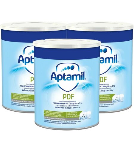 Muttermilch ist die ideale Nahrung für Säuglinge in den ersten Monaten. Sie ist gut verdaulich und so zusammengesetzt, dass sie im ersten Lebenshalbjahr den Bedarf an Nährstoffen und Flüssigkeit deckt. Bei alternativer Ernährung mit Muttermilchersatzprodukten beachten Sie die Hinweise und Zubereitungsanleitungen auf den Packungen genau, denn eine unsachgemäße Zubereitung von Säuglingsanfangsnahrung kann zu gesundheitlichen Beeinträchtigungen führen. Wir empfehlen, sich vor Anwendung von Muttermilchersatznahrung ärztlich beraten zu lassen.Bitte achten Sie auf eine abwechslungsreiche und ausgewogene Ernährung und gesunde Lebensweise. Aptamil PDF für Frühgeborene Einzigartige Expertise Basierend auf über 40 Jahren Forschung hat das Aptamil Team mit mehr als 500 NUTRICIA-Wissenschaftlern und -Experten dazu beigetragen, ein einzigartiges Aptamil® PDF (Post Discharge Formula) zu entwickeln. Aptamil® PDF ist speziell für Frühgeborene mit einem erhöhten Wachstumsbedarf nach Klinikentlassung ab einem Körpergewicht von 1.800 g bestimmt. Aptamil® PDF - Entwickelt für Frühgeborene mit erhöhtem Wachstumsbedarf nach Klinikentlassung Hohes Protein:Energieverhältnis Essentielle Nährstoffe Unterstützt Aufholwachstum Zutaten:Lactose, Magermilch, pflanzliche Öle (Sonnenblumen-, Rapsöl, mittelkettige Triglyceride (aus Kokosnuss- und Palmöl), Nachtkerzenöl), Oligosaccharide (Galactooligosaccharide (aus MILCH), Fructooligosaccharide), MILCHFETT, Molkenprotein (aus MILCH), Maltodextrin, EILIPIDE, Calciumcarbonat, FISCHÖL, Calciumorthophosphat, Kaliumcitrat, Öl aus Mortierella alpina, Natriumchlorid, Magnesiumorthophosphat, Inositol, Vitamin C, Emulgator (SOJALECITHIN), Cholinchlorid, Taurin, Eisen-II-sulfat, Zinksulfat, Vitamin E, Nucleotide (Natriumsalze von Cytidin-, Uridin-, Inosin-, Adenosin-, Guanosin-5-Monophosphaten), Niacin, Pantothensäure, L-Carnitin, Kupfersulfat, Vitamin A, Vitamin B1, Vitamin B6, Vitamin B2, Folsäure, Kaliumjodid, Mangan-II-sulfat, Vitamin K, Biotin, Natriumselenit, Vitamin D, Vitamin B12Nährwerte: Nährwerte pro 100 g Pulver Energie 2058 kJ / 492 kcal Fett 26 g -davon gesättigte Fettsäuren 10,1 g -mehrfach ungesättigte Fettsäuren 4,2 g Kohlenhydrate 49,3 g -davon Zucker 40,8 g Ballaststoffe 3,7 g Eiweiß 13,5 g Salz 0,45 g Vitamin A 654 µg Vitamin D 11 µg Vitamin E 14 µg Vitamin K 39 µg Vitamin C 77 mg Thiamin 0,61 mg Riboflavin 1 mg Niacin 7,8 mg Vitamin B6 0,52 mg Folsäure 131 µg Vitamin B12 1,7 µg Biotin 20 µg Pantothensäure 3,9 mg Verzehrempfehlung: Anzahl und Trinkmenge pro Fläschchen variieren individuell. Die durchschnittliche Trinkmenge beträgt 150-170 ml/kg Körpergewicht und Tag. Bitte verwenden Sie nur den beiligenden Messlöffel, dieser fasst gestrichen voll ca. 5,1 g.Hinweis: Die angegebene empfohlene tägliche Verzehrmenge darf nicht überschritten werden.Aufbewahrung: Kühl (6-25 °C) und lichtgeschützt lagern. Außerhalb der Reichweite von Kindern aufbewahren.Nettofüllmenge: 400 g PulverHerstellerdaten: Milupa Nutricia GmbH... ...