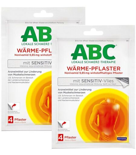 ABC® Wärme-Pflaster mit Sensitiv-Vlies 14 cm x 10 cm Kombiniert intensive Heilwärme mit hohem Tragekomfort Intensive, lang anhaltende Wirkung Leicht ablösbar – sanft zur Haut Die ABC Lokale Schmerz-Therapie Wärme-Pflaster mit Sensitiv-Vlies entfalten eine intensive, lang anhaltende Wirkung. Sie sind leicht ablösbar und besonders sanft zur Haut. Das Pflaster kombiniert intensive Heilwärme mit hohem Tragekomfort. AnwendungsgebietZur äußerlichen symptomatischen Behandlung von Muskelschmerzen im Bereich der Lendenwirbelsäule und der Nackenmuskulatur. WirkstoffNonivamid, 1 Pflaster enthält 9,85 mg Nonivamid Pflichttexte:Zu Risiken und Nebenwirkungen lesen Sie die Packungsbeilage und fragen Sie Ihren Arzt oder Apotheker. Wirkstoff:NonivamidAnwendungsgebiete Zur äußerlichen symptomatischen Behandlung von Schmerzen der Muskeln im Bereich der Lendenwirbelsäule und der Nackenmuskulatur.Enthält Methyl-4-hydroxybenzoat und Propylenglykol. InhaltsstoffeNonivamid. Carmellose-Natrium, Aluminium-glycinat-dihydroxid, Gelatine, Glycerol, Weißer Ton, 5,6 mg Methyl-4-hydroxybenzoat, Natriumedetat, Natriumpolyacrylat, Polyacrylsäurelösung (20%), Polysorbat 80, Polyvinylalkohol, Propylenglycol, Rizinusöl, Sorbitol-Lösung 70%,Weinsäure, gereinigtes Wasser. ...