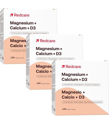 Nahrungsergänzungsmittel sind kein Ersatz für eine abwechslungsreiche und ausgewogene Ernährung und einen gesunden Lebensstil.Redcare Magnesium + Calcium + D3Knochen und Muskeln stützen Ihren Körper Tag für Tag. Möchten Sie Ihrem Bewegungsapparat etwas Gutes tun? Das Präparat von RedCare enthält eine harmonische Kombination aus Kalzium, Vitamin D und Magnesium. Ein weiterer Vorteil ist, dass Sie keine unnötigen Hilfsstoffe zu sich nehmen. Redcare Magnesium + Calcium + D3 ist somit deutlich reiner als vergleichbare Präparate in Tablettenform. Die Kapseln unterstützen Sie jeden Tag ideal mit verschiedenen Mikronährstoffen: Calcium trägt zur Erhaltung normaler Knochen und Zähne sowie zu einer normalen Funktion des Energiestoffwechsels bei. Vitamin D trägt zu einer normalen Kalziumaufnahme und einem normalen Kalziumspiegel im Blut bei. Vitamin D, Calcium und Magnesium tragen zur Aufrechterhaltung einer normalen Muskelfunktion bei. Nehmen Sie zwei bis drei Kapseln pro Tag mit viel Flüssigkeit (z. B. einem großen Glas Wasser) ein. Redcare Magnesium + Calcium + D3 enthält 180 Kapseln - ideal für eine Einnahme über zwei bis drei Monate.Inhaltsstoffe:Calciumcarbonat, Magnesiumoxid, Reismehl, Überzugsmittel: Hydroxypropylmethylcellulose, Trennmittel: Calciumsalze von Speisefettsäuren, Cholecalciferol Nährwerte: Nährstoffe: 2 Kapseln* NRV** 3 Kapseln* NRV** Vitamin D 6,7 µg 133 % 10 µg 200 % Calcium 300 mg 37 % 450 mg 56 % Magnesium 167 mg 45 % 250 mg 67 % * Angegebene tägliche Verzehrmenge ** Anteil an der Referenzmenge für die Nährstoffzufuhr Verzehrempfehlung:Nehmen Sie zwei bis drei Kapseln täglich mit viel Flüssigkeit (z. B. einem großen Glas Wasser) ein. Redcare Magnesium + Calcium + D3 enthält 180 Kapseln - ideal für eine Einnahme über zwei bis drei Monate.Hinweis: Magnesiumpräparate können eine abführende Wirkung haben. Sie sollten auf andere magnesium- oder calciumhaltige Nahrungsergänzungsmittel verzichten.Die angegebene empfohlene tägliche Verzehrmenge darf nicht überschritten werden. Außerhalb der Reichweite von kleinen Kindern aufbewahren.Aufbewahrung: Kühl (6-25 °C) und lichtgeschützt aufbewahren. Außerhalb der Reichweite von kleinen Kindern aufbewahren.Nettoverteilung: 3 x 180 KapselnDaten des Herstellers: Shop-Apotheke B.V.Erik de Rodeweg 11/135975 WD SevenumNiederlande ...
