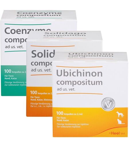 Im Set enthalten: Ubichinon compositum ad us. vet. Ampullen Solidago compositum ad us. vet. Ampullen Coenzyme compositum ad us. vet. Ubichinon compositum ad us. vet. Ampullen Tiere im Alter: Gesundheit fördern, Lebensqualität erhalten. Dank guter Fütterung und Pflege werden unsere Haustiere heute immer älter. Wie bei uns Menschen geht das Alter aber auch an den Vierbeinern nicht spurlos vorüber: Typische Alterserscheinungen“ wie ein erhöhtes Ruhebedürfnis, aber auch chronische Erkrankungen können die Lebensqualität betagter Tiere teilweise stark einschränken. Zwar lassen sich altersbedingte Leiden nicht gänzlich verhindern, regelmäßige Check-ups beim Tierarzt helfen aber dabei, Erkrankungen frühzeitig zu erkennen und zu behandeln. Dadurch können Sie als Halter das Wohlbefinden Ihres Tieres entscheidend fördern. Biologische Tierarzneimittel können dabei den Gesundheitszustand und die Lebensqualität gut unterstützen. Biologische Tiermedizin: wirksam und gut verträglich Die biologischen Tierarzneimittel von Heel bestehen aus mehreren effektiven Einzelsubstanzen (multicomponent) und wirken gleichzeitig an zahlreichen Stellen des Körpers (multitarget), um die Ursachen einer Erkrankung nachhaltig anzugehen. Anstelle der Verabreichung einer Vielzahl verschiedener Einzelmedikamente lassen sich mit Heel Tierarzneimitteln auch komplexe Erkrankungen nebenwirkungsarm und entsprechend den natürlichen Prozessen im Körper behandeln. Gut zu wissen Die Abkürzung ad us. vet. steht für ad usum veterinarium“, kommt aus dem Lateinischen und bedeutet zum tierarzneilichen Gebrauch“. Diese Arzneimittel sind speziell für Tiere registriert. Tierhalter finden in den Beipackzetteln die für verschiedene Tierarten angepassten Dosierungshinweise. Biologische Tierarzneimittel zeichnen sich durch ihre gute Verträglichkeit aus, sind dadurch auch zur langfristigen Gabe geeignet und können je nach Erkrankung entweder einzeln oder in Kombination mit anderen Medikamenten verabreicht werden. Mehrere effektive Einzelsubstanzen (multicomponent)… …wirken an zahlreichen Stellen des Körpers (multitarget) Gut verträglich Nebenwirkungsarm Mit anderen Arzneimitteln kombinierbar Solidago compositum ad us. vet. Ampullen Tiere im Alter: Gesundheit fördern, Lebensqualität erhalten. Dank guter Fütterung und Pflege werden unsere Haustiere heute immer älter. Wie bei uns Menschen geht das Alter aber auch an den Vierbeinern nicht spurlos vorüber: Typische Alterserscheinungen“ wie ein erhöhtes Ruhebedürfnis, aber auch chronische Erkrankungen können die Lebensqualität betagter Tiere teilweise stark einschränken. Zwar lassen sich altersbedingte Leiden nicht gänzlich verhindern, regelmäßige Check-ups beim Tierarzt helfen aber dabei, Erkrankungen frühzeitig zu erkennen und zu behandeln. Dadurch können Sie als Halter das Wohlbefinden Ihres Tiereas entscheidend fördern. Biologische Tierarzneimittel können dabei den Gesundheitszustand und die Lebensqualität gut unterstützen. Biologische... ...
