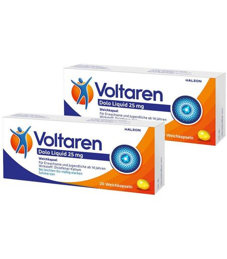 Voltaren Dolo Liquid 25 mg Weichkapseln, gegen Muskelschmerzen 20 St. SCHNELLERE* SCHMERZLINDERUNG: Die Weichkapseln mit 25 mg Diclofenac-Kalium wirken schnell und effektiv bei der Behandlung von Schmerzen, z. B. im unteren Rücken *Im Vergleich zu Voltaren Dolo 25 mg Tabletten EINZIGARTIGE FORMULIERUNG: Voltaren Dolo Liquid Weichkapseln sind bereits innerhalb von 15 Minuten an der schmerzenden Stelle BEI RÜCKEN- UND MUSKELSCHMERZEN: Wirksame Linderung von Gelenkschmerzen, Schulterschmerzen, Nackenschmerzen und Rückenschmerzen z. B. im unteren Rücken sowie bei Muskelschmerzen BEKÄMPFT ENTZÜNDUNGEN: Der Wirkstoff Diclofenac lindert nicht nur Schmerzen, sondern bekämpft gleichzeitig eine ihrer häufigsten Ursachen – die Entzündung SCHNELL AUFLÖSEND: Voltaren Dolo Liquid Weichkapseln enthalten den Wirkstoff bereits in gelöster Form Die Voltaren-Weichkapsel bei leichten bis mäßig starken Schmerzen, - Fieber Bei leichten bis mäßig starken Schmerzen und Fieber sind Voltaren Dolo Liquid 25 mg Weichkapseln die Alternative zum Schmerzgel – ideal auch für unterwegs. WIE PROFITIEREN SIE? Lassen Sie nicht zu, dass Sie wegen Ihrer Schmerzen das Wichtigste aus den Augen verlieren. Mit Voltaren Dolo Liquid, der wirksamen Weichkapsel gegen Schmerzen, können Sie Ihren Alltag wieder aktiv gestalten. Die Weichkapseln mit schmerzlindernder Formulierung enthalten den Wirkstoff bereits in gelöster Form und werden schnell vom Körper aufgenommen. Sie wirken schnell und effektiv gegen Muskelschmerzen, Gelenkschmerzen, Nackenschmerzen, Schulterschmerzen, Gelenkscherzen und Rückenschmerzen. So können Sie Ihren Schmerzen den Kampf ansagen. Voltaren Dolo Liquid ist bereits innerhalb von 15 Minuten da, wo es weh tut, sodass Sie wieder selbstbewusst Freude an der Bewegung haben können. Der Wirkstoff Diclofenac lindert nicht nur spürbar Schmerzen, sondern bekämpft gleichzeitig eine ihrer häufigsten Ursachen – die Entzündung. WIE WIRD ES ANGEWENDET? Voltaren Dolo Liquid sind schnell auflösende Weichkapseln, die ideal für den hektischen Alltag oder für unterwegs sind. Die maximale Tagesdosis von drei Weichkapseln darf nicht überschritten werden. Verwenden und entsorgen Sie Arzneimittel verantwortungsbewusst. Weitere Informationen finden Sie in der Packungsbeilage. Inhaltsstoffe: Der Wirkstoff ist: Diclofenac-Kalium 25 mg pro Weichkapsel. Die sonstigen Bestandteile sind: Macrogol 600; Gelatine; Glycerol 85 %; gereinigtes Wasser; Sorbitol flüssig; partiell dehydratisiert (enthält Sorbitan, Mannitol); Farbstoff (E 104) Wirkstoff: Diclofenac-Kalium Anwendungsgebiete: Voltaren Dolo Liquid 25mg wird eingenommen zur symptomatischen Behandlung von leichten bis mäßig starken Schmerzen, - Fieber. Die empfohlene Dosis beträgt: Für Erwachsene und Jugendliche ab 14 Jahren: Nehmen Sie zu Beginn 1 Weichkapsel ein, danach können Sie je nach Bedarf alle 4 bis 6 Stunden 1 Weichkapsel einnehmen. Nehmen Sie nicht mehr als 3 Weichkapseln innerhalb von 24 Stunden ein. Voltaren Dolo Liquid soll nur... ...
