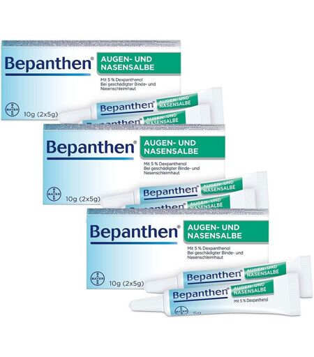 Bei leichten Schädigungen von Binde-, Horn- oder Nasenschleimhaut: Bepanthen® Augen- und Nasensalbe Die Vorteile der Bepanthen® Augen- und Nasensalbe auf einen Blick: fördert die Heilung bei leichten Verletzungen von Binde- oder Hornhaut sowie der Nasenschleimhaut sorgt für eine nachhaltige Regeneration der Wirkstoff Dexpanthenol beschleunigt die Neubildung von Hautzellen keine Farb-, Duft- und Konservierungsstoffe Unterstützen Sie mit der Bepanthen® Augen- und Nasensalbe die Heilung von trockener, rissiger Nasenschleimhaut sowie leichten Verletzungen am Auge (Binde- und Hornhaut) – und sorgen Sie damit für eine nachhaltige Regeneration. Dank des Wirkstoffes Dexpanthenol wird die Neubildung von Zellen angeregt und die natürliche Heilung gefördert. Die Bepanthen® Augen- und Nasensalbe ist gut verträglich und frei von Farb-, Duft- und Konservierungsstoffen. Bepanthen® Augen- und Nasensalbe für eine nachhaltige Regeneration Im Sommer ist es die Allergie, im Winter der Schnupfen – läuft die Nase, greifen wir vermehrt zum Taschentuch oder bei verstopfter Nase zu abschwellenden Nasensprays. Das hat allerdings zur Folge, dass die Nasenschleimhaut nach und nach austrocknet und gereizt reagiert. Sie fühlt sich trocken an, brennt oder juckt und bildet gelegentlich Krusten. Doch nicht nur das Innenleben der Nase kann bei Allergie oder Schnupfen leiden. Ständiges, kräftiges Naseputzen schadet beispielsweise den Nasenflügeln: Sie reagieren empfindlich, röten sich und können schmerzen. Für alle, die an einer wunden Nase oder einer trockenen, rissigen Nasenschleimhaut leiden: Die Bepanthen® Augen- und Nasensalbe unterstützt die Heilung, befeuchtet, beruhigt und pflegt – die Nase kann sich nachhaltig regenerieren. Im Auge entfaltet die Bepanthen® Augen- und Nasensalbe ihre heilungsfördernde Wirkung bei leichten Verletzungen der Bindehaut und Hornhaut. Die Bepanthen® Augen- und Nasensalbe weist folgende Vorteile auf: unterstützt den natürlichen Heilungsprozess sanft und wirksam bei leichten, oberflächlichen Schädigungen an Auge und Nase enthält keine Konservierungsstoffe Die Anwendung ist einfach und praktisch: Tragen Sie mithilfe der Kanüle einen Salbenstrang von etwa einem Zentimeter Länge am Bindehautsack des Auges (zwischen Augapfel und Unterlid) oder auf der Nasenschleimhaut auf – und das mehrmals täglich, sofern nicht anders verordnet. Da die Salbe steril und ohne Konservierungsstoffe hergestellt wird, darf sie am Auge nicht länger als eine Woche angewendet werden. An der Nase ist ein Gebrauch der Salbe bis zu vier Wochen möglich. Für Säuglinge und Kinder sollte weniger Salbe verwendet werden. Zu beachten ist außerdem: Tuben der Bepanthen® Augen- und Nasensalbe, die einmal in der Nase angewendet wurden, dürfen anschließend nicht mehr am Auge verwendet werden. Wenn Sie Kontaktlinsenträger sind und die Bepanthen® Salbe am Auge anwenden möchten, nehmen Sie die Kontaktlinsen vor der Verwendung bitte heraus. Denn einerseits kann der Kontakt mit der Salbe die... ...