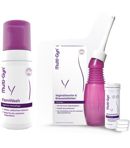 Das Set besteht aus: Multi-Gyn FemiWash 100 ml Multi-Gyn® Vaginaldusche + Brausetabletten Kombipack Multi-Gyn FemiWash Seifenfreier Mikroschaum zur Anwendung im äußeren Intimbereich Sie wünschen sich jeden Tag ein frisches Gefühl? Multi-Gyn FemiWash basiert auf dem 2QR-Komplex, ist ohne Duftstoffe, sanft und pflegend. Multi-Gyn FemiWash reinigt und erfrischt den Intimbereich. Die seifenfreie, sanfte Formel ist selbst für die empfindlichste und zarteste Haut geeignet. Ihre erste Wahl für die tägliche Intimpflege. Multi-Gyn FemiWash für die tägliche Frische im Intimbereich Millionen von Frauen haben täglich Beschwerden im Intimbereich. Dennoch ist die Scheidengesundheit in vielen Ländern nach wie vor ein Tabuthema. Jede Frau ist in ihrem Leben mit Faktoren konfrontiert, die sich auf ihr Scheidenmilieu auswirken, wie z. B. Hormonhaushalt, sexuelle Aktivität, Menstruationszyklus, Menopause und Erkrankungen. Sanft und pflegend, ohne Duftstoffe Multi-Gyn FemiWash reinigt und erfrischt den Intimbereich sanft und eignet sich insbesondere zur Anwendung bei sehr empfindlicher Haut. Der Mikroschaum ist ideal für die tägliche Intimpflege und auch hervorragend für eine sanfte Rasur geeignet. Ideal für eine sanfte Intimrasur Multi-Gyn FemiWash ist ideal für die tägliche Intimpflege und auch hervorragend für eine sanfte Rasur geeignet. Der Multi-Gyn FemiWash reinigt und erfrischt den Intimbereich. Der Mikroschaum ist mild und angenehm, auch bei sehr empfindlicher und überempfindlicher Haut. Reicht für ca. 120 Anwendungen Multi-Gyn FemiWash ist seifenfrei, parfumfrei und schützt die natürliche Scheidenflora. Der praktische Pumpspender dosiert den Schaum in der richtigen Menge, sodass ca. 120 Anwendungen möglich sind. Die Anwendung des Mikroschaums Multi-Gyn® FemiWash Die Intimwaschlotion Multi-Gyn FemiWash können Sie bedenkenlos für die tägliche Intimpflege oder -rasur verwenden: Ein Pumpstoß genügt, damit Sie ausreichend Waschlotion auf Ihrem Intimbereich verteilen können. Verteilen Sie den Mikroschaum gleichmäßig über Ihren äußeren Genitalbereich. Spülen Sie die Intim-Waschlotion anschließend mit Wasser ab. Sie können Multi-Gyn FemiWash nicht nur in der Dusche, sondern auch beim Baden oder bei der Intimwäsche am Waschbecken verwenden. Die enthaltenen 100 ml des Intim-Waschgels Multi-Gyn FemiWash reichen bei täglicher Verwendung für ca. 120 Anwendungen bzw. bis zu vier Monate. Hinweise für die Verwendung von Multi-Gyn® FemiWash: Wenden Sie den Intim-Waschschaum Multi-Gyn FemiWash nur im äußeren Genitalbereich an. Multi-Gyn FemiWash eignet sich bedenkenlos für die tägliche Anwendung. Wirkstoffe: Aqua, Glycerin, Aloe barbadensis Leaf Extract, Sodium Cocoamphoacetate, Laureth-10Sodium Laureth-11 Carboxylate, Glycereth-2 Cocoate, Sodium Lactate, Lactic Acid, Caprylyl Glycol, Panthenol. Multi-Gyn® Vaginaldusche + Brausetabletten Kombipack Spült effizient und schonend Die Multi-Gyn Vaginaldusche bietet höchsten Komfort und funktioniert in jeder Position, die für Sie... ...