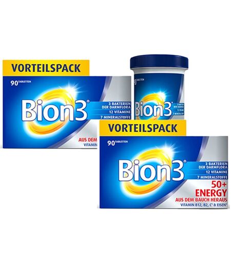 Nahrungsergnzungsmittel sind kein Ersatz für eine ausgewogene und abwechslungsreiche Ernährung und eine gesunde Lebensweise. Bion® 3 50+ Energy ENERGIE1 AUS DEM BAUCH HERAUS2: Vitamin B2, Biotin zur Unterstützung des Darms2; B12, B6, C zur Freisetzung körperlicher und mentaler Energie1, Eisen, Zink zur Unterstützung der kognitiven Funktionen. Jeder Mensch braucht Energie für sein Leben. Aber man hat nicht genug Energie, wenn man sich nicht um sein Energiezentrum, den Darm, kümmert! Der Darm ist das Zentrum des körpereigenen Verdauungssystems, in dem wichtige Nährstoffe, wie Vitamine & Mineralstoffe, aufgenommen werden, um den Energiestoffwechsel zu unterstützen. Bion3 50+ Energy ist ein Multivitamin & Nahrungsergänzungsmittel, das wissenschaftlich für Menschen ab 50 Jahren entwickelt wurde. Mit ausgewählten Nährstoffen zur Unterstützung des Darms2, zur Förderung der körperlichen & mentalen Energie und zur Verringerung von Müdigkeit1, damit Du Deine Energie bewahrst und die Dinge, die Du gerne tust, auch nach 50 noch genießen kannst. Bion3 50+ Energy kombiniert in einer 3-in-1 Tablette: 3 Bakterien der Darmflora, die dank eines speziellen Überzugs lebend3 in den Darm gelangen. 12 Vitamine, darunter B2, Biotin zur Unterstützung des Darms2, B12, B6, Vitamin C zur Unterstützung der körperlichen Energie1 & Panthothensäure zur Unterstützung der mentalen Energie1. 4 Mineralstoffe, darunter Eisen, das zu einem normalen energiereichen Stoffwechsel & zur Verringerung von Müdigkeit beiträgt, und Zink, das zu einer normalen kognitiven Funktion beiträgt. Bequeme Ein-Tages-Dosierung: Erwachsene 50+: 1 leicht zu schluckende Tablette pro Tag mit einem Glass Wasser, während oder nach einer Mahlzeit, einnehmen. 1Die Vitamine B12, Pantothensäure, B6, Vitamin C sowie Eisen tragen zu einem normalen Energiestoffwechsel und zur Verringerung von Müdigkeit bei. Pantothensäure trägt zu einer normalen geistigen Leistung bei, Eisen & Zink tragen zu einer normalen kognitiven Funktion bei. 2Die Vitamine B2 und Biotin tragen zur Erhaltung normaler Schleimhäute bei. Im Darm befindet sich eine der größten Schleimhäute. Der Darm ist dasZentrum der Verdauung, wo wichtige Nährstoffe wie Vitamine und Mineralstoffeaufgenommen werden, um den Energiestoffwechsel zu unterstützen. 3Venema, K., et al. Letters in Applied Microbiology, 2019; 69(5), 325-332. Zutaten: Füllstoff: Cellulose; Tricalciumphosphat; Inulin; Füllstoff: Calciumphosphate; Calcium-L-ascorbat; Magnesiumoxid; Überzugsmittel: Hydroxypropylmethylcellulose; Stärke; Dextrose; Trennmittel: Mono- und Diglyceride von Speisefettsäuren; Überzugsmittel: Hydroxypropylcellulose; Nicotinamid; Füllstoffe: Polyvinylpyrrolidon, Polyvinylpolypyrrolidon, Vernetzte Natriumcarboxymethylcellulose; DL-alpha-Tocopherylacetat; Glukosesirup; Maltodextrin; Eisensulphat; Trennmittel: Magnesiumsalze der Speisefettsäuren, Siliciumdioxid, Talkum; Modifizierte Stärke; Kaliumchlorid; Ginsengwurzelextrakt (Panax ginseng C.A.... ...