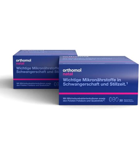 Nahrungsergänzungsmittel sind kein Ersatz für eine ausgewogene und abwechslungsreiche Ernährung und eine gesunde Lebensweise. Orthomol Natal Orthomol Natal bietet in Schwangerschaft und Stillzeit eine umfassende Versorgung mit allen empfohlenen Mikronährstoffen und unterstützt so den positiven Verlauf Deiner Schwangerschaft, die gesunde Entwicklung Deines Kindes sowie Dein Wohlbefinden. Du hast die Wahl zwischen zwei Darreichungsformen. Bei Bedarf mit flexibler Jodversorgung. Ohne künstliche Süßungsmittel. Bestens versorgt in der Schwangerschaft Egal, ob langersehnter Kinderwunsch oder freudige Überraschung: eine Schwangerschaft stellt das bisherige Leben erst einmal auf den Kopf. Sowohl die Schwangerschaft selbst als auch die spätere Stillzeit sind ganz besondere Phasen im Leben vieler Frauen. In diesen vollbringt der Körper wahre Höchstleistungen, wodurch der Bedarf an bestimmten Mikronährstoffen über den Normalbedarf hinaus ansteigt. Mikronährstoffversorgung in der Stillzeit Auch in der Stillzeit ist der Mikronährstoffbedarf weiterhin erhöht. Denn zusätzlich zu Deiner eigenen Versorgung gibst Du über die Muttermilch viele Nährstoffe an Dein Baby weiter, die für eine gesunde Entwicklung benötigt werden. Zudem haben die Schwangerschaft und auch die Geburt Deinem Körper viel abverlangt – unterstütze deshalb aktiv Deine Regeneration und Dein Wohlbefinden. Orthomol Natal mit dem Mutter-Kind-Plus Orthomol Natal kombiniert essenzielle Mikronährstoffe mit dem Mutter-Kind-Plus (Omega-3-Fettsäure DHA, Vitamin D3, Milchsäurebakterienkulturen) und liefert ab Schwangerschaftseintritt wichtige Nährstoffe für die Entwicklung Deines Kindes, Dein Wohlbefinden und für einen positiven Schwangerschaftsverlauf. Mit einer Kombination aus Folsäure und Quatrefolic® als Beitrag zum normalen mütterlichen Gewebewachstum in der Schwangerschaft. Quatrefolic® ist eine aktive Form der Folsäure, die dem Körper ohne vorherige Umwandlung zur Verfügung steht und somit eine höhere Bioverfügbarkeit aufweist. Nutritive Eigenschaften * Mit Folsäure als Beitrag zum normalen mütterlichen Gewebewachstum in der Schwangerschaft. Mit der Omega-3-Fettsäure DHA und Milchsäurebakterienkulturen. Mehr von Orthomol entdecken: Zutaten: pro Tagesportion % RM** Vitamine Vitamin A, davon 333 µg REΔ 42 aus Beta-Carotin 333 µg REΔ Vitamin D 15 µg (600 I.E.°) 300 Vitamin E 36 mg alpha-TE°° 300 Vitamin K 60 µg 80 Vitamin C 110 mg 138 Thiamin (Vitamin B₁) 3 mg 273 Riboflavin (Vitamin B₂) 3,5 mg 250 Niacin 12 mg NE* 75 Vitamin B₆ 5 mg 357 Folsäure, davon 500 µg 250 als Pteroylmonoglutaminsäure 300 µg als (6S)-5-Methyltetrahydrofolsäure-Glucosaminsalz (Quatrefolic®) 200 µg Vitamin B₁₂ 9 µg 360 Biotin 150 µg 300 Pantothensäure 18 mg 300 Mineralstoffe Calcium 200 mg 25 Magnesium 100 mg 27 Eisen 5 mg 36 Zink 5 mg 50 Kupfer 1 mg 100 Selen 30 µg 55 Chrom 30 µg 75 Molybdän 80 µg 160 Jod 150 µg 100 Sonstige Stoffe Omega-3-Fettsäuren, davon 360 mg ***... ...