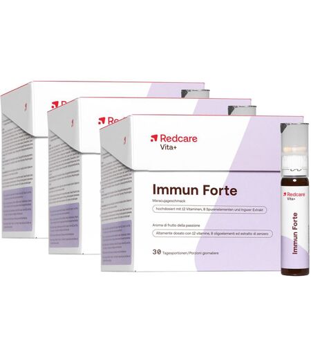 Nahrungsergänzungsmittel sind kein Ersatz für eine abwechslungsreiche und ausgewogene Ernährung und eine gesunde Lebensweise.Redcare Immun Forte Ein funktionierendes Immunsystem ist essentiell für die Gesundheit und das körperliche Wohlbefinden. Dafür ist die Versorgung mit verschiedenen Nährstoffen wichtig. Redcare Immun Forte kombiniert die dafür wichtigsten Pflanzenstoffe, Vitamine und Mineralien. Durchdachte Kombination aus Trinkampullen & Kapseln Mit Vitaminen, Spurenelementen & Pflanzenstoffen Fruchtiger Maracuja-GeschmackDas Immunsystem wirkt Tag und Nacht als wichtigster Schutzmechanismus des Körpers. Die Funktion des Immunsystems ist stark abhängig von der richtigen Nährstoffzufuhr. Deshalb gehören Vitamine wie Vitamin C und D sowie Mineralstoffe wie Eisen und Zink zu einer ausgewogenen Ernährung dazu. Denn gerade diese Vitamine und Mineralstoffe tragen zur normalen Funktion des Immunsystems bei. Sie erfüllen aber auch weitere Aufgaben, die den Körper am Laufen halten. Redcare Immun Forte enthält 12 Vitamine und 8 Spurenelemente, welche wichtige Funktionen im menschlichen Körper erfüllen. Dazu zählen: Eisen, Kupfer, Selen, Zink sowie Folsäure und die Vitamine B6, B12, C und D leisten einen Beitrag zu einer normalen Funktion des Immunsystems. Eisen, die Vitamine B2, B3, B5, B6, B12, Folsäure und Vitamin C tragen zur Verringerung von Müdigkeit und Ermüdung bei. Kupfer, Mangan, Vitamin B2 sowie Vitamin C und E tragen dazu bei, die Zellen vor oxidativem Stress zu schützen.Zusätzlich enthalten die Redcare Immun Forte Trinkampullen hochdosierten Ingwer-Extrakt sowie wertvolle Carotinoide, Lycopin und Flavonoide. Jede Tagesdosis des Redcare Immun Forte besteht aus einer Trinkampulle sowie zwei separaten Kapseln. Die gelbe Kapsel enthält 100 % des Tagesbedarfs an Folsäure sowie 33 % des Tagesbedarfs an Vitamin K. Die weiße Kapsel deckt den täglichen Bedarf an Jod. Personen, bei denen (beispielsweise aufgrund einer Schilddrüsenerkrankung) die Supplementierung von Jod nicht sinnvoll ist, können so ganz einfach auf die Einnahme der Kapsel verzichten. Täglich eine Ampulle gemeinsam mit den Kapseln vor oder zu einer Mahlzeit einnehmen. Die Ampulle vor dem Verzehr gut schütteln. Redcare Immun Forte ist für die dauerhafte Einnahme geeignet – jede Box enthält 30 Tagesportionen.Zutaten: Ampulle (Wasser, Birnensaftkonzentrat, Orangensaftkonzentrat, L-Ascorbinsäure, Natrium-L-Ascorbat, Ingwer Extrakt, Eisengluconat, DL-alpha-Tocopherylacetat, Nicotinamid, Verdickungsmittel: (Xanthan), Säuerungsmittel: (Milchsäure), Zinkcitrat, D-Panthenol, bioflavonoidreicher Zitrusfruchtextrakt, Thiaminhydrochlorid, Riboflavin, Kupfergluconat, Mangansulfat, Pyridoxinhydrochlorid, gemischte Carotinoide (Carotinoide, Carotin, Lycopin, Lutein, Capsanthin, Capsorubin), Natriummolybdat, D-Biotin, Chrom-(III)-Chlorid, Natriumselenat, Cholecalciferol, Cyanocobalamin, Süßungsmittel: (Steviolglykoside), Konservierungsstoff: (Kaliumsorbat), Aroma), Jod-Kapsel... ...
