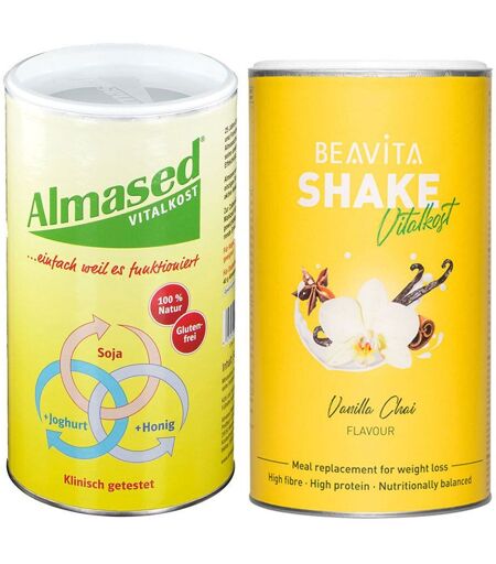 Bitte achten Sie auf eine abwechslungsreiche und ausgewogene Ernährung und gesunde LebensweiseMahlzeit für eine gewichtskontrollierende ErnährungSet besteht aus: BEAVITA Vitalkost Plus Vanilla Chai 572 g Almased Vital-Pflanzen-Eiweißkost 500 g Bitte achten Sie auf eine abwechslungsreiche und ausgewogene Ernährung und gesunde LebensweiseMahlzeit für eine gewichtskontrollierende Ernährung BEAVITA Vitalkost Plus Vanilla Chai Natürliche Süße aus Honig Wertvolles Protein Bester Geschmack Was sind die Vorteile vom BEAVITA Mahlzeitenersatz? Ein Shake mit weniger als 210 kcal ersetzt eine komplette Mahlzeit und versorgt dich dabei mit wichtigen Vitaminen und Mineralstoffen. Mehr als 25 g pflanzliches Protein pro Portion (je nach Sorte mehr) schützen dich vor dem Abbau wertvoller Muskelmasse während deiner Diät. Entscheide selbst, welche deiner Mahlzeiten du ersetzen möchtest. Die BEAVITA Vitalkost lässt sich außerdem als 14-Tage-Diät anwenden. In der ersten Phase (Tag 1-2) werden alle drei Mahlzeiten durch einen Shake ersetzt. In Phase 2 (Tag 3-9) werden nur noch zwei und in Phase 3 (Tag 10-14) nur noch eine Mahlzeit ersetzt. Deine Mahlzeiten in Phase 2 & 3 sollten gesund und kalorienbewusst sein. 2-3 Liter Wasser am Tag stehen zusätzlich auf dem Plan.Wähle aus abwechslungsreichen Geschmackssorten wie Schoko, Vanilla Chai oder Mango Lassi. Bei einer Milchzucker-Unverträglichkeit empfehlen wir dir die BEAVITA Vitalkost, Laktosefrei. Wie bereite ich den BEAVITA Vitalkost Shake zu?Der Shake lässt sich ganz einfach und schnell zubereiten und überzeugt durch seine Cremigkeit und angenehme Süße. Für einen Shake einfach 4 gehäufte EL (57 g) in 300 ml Wasser einrühren. Natürlich kannst du deinen BEAVITA-Mahlzeitenersatz nach Belieben verfeinern. Frisches Obst oder knackige Nüsse beispielsweise bringen Abwechslung in deinen Diät-Shake. So lässt sich dieser Mahlzeitenersatz auch problemlos in deinen Alltag integrieren. Die schnelle Zubereitung ermöglicht es dir auch unterwegs oder im Büro auf einen ausgewogenen Shake zurückzugreifen. Hier unser Rezept für einen Kurkuma-Shake Chai Latte Vanille: Du benötigst: 57 g BEAVITA Vitalkost Plus Vanilla Chai 150 ml heißes Wasser 150 ml Mandelmilch 1 TL nu3 Kurkuma Pulver So gehst du vor: BEAVITA Pulver und Kurkuma in heißes Wasser einrühren. Milch erhitzen und aufschäumen. Aufgeschäumte Milch zuerst in ein Glas schütten, danach die Vanille-Kurkuma-Mischung langsam in die Milch gießen. PflichtangabenZutaten: Sojaeiweiß-Isolat (45%), Honigpulver (20%) (Maltodextrin, Honig (48%)), Polydextrose, Sojaöl, Aromen, Kaliumcitrat, Verdickungsmittel (Johannisbrotkernmehl), Trennmittel (Siliciumdioxid), Calciumcarbonat, Glukosesirup, modifizierte Stärke, Dikaliumphosphat, Magnesiumcarbonat, Flohsamenschalenpulver, Gewürze (Zimt, Nelken, Kardamom, Fenchel, Anis), Speisesalz, Milcheiweiß, Süßungsmittel (Sucralose), Farbstoff (Carotin), Stabilisator (Triphosphate), L-Ascorbinsäure, Zinkgluconat,... ...
