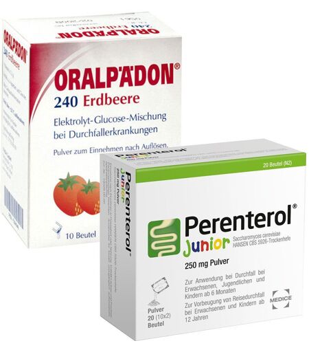 Set bestehend aus:10 Beutel Oralpädon® 240 Erdbeere Pulver20 Beutel Perenterol® Junior 250 mg PulverOralpädon® 240 Erdbeere PulverIndikation/AnwendungDas Präparat ist ein Arzneimittel zur oralen Behandlung eines Flüssigkeitsmangels (Dehydratation) durch Ausgleich der Salz- und Wasserverluste. Es enthält Salze (Elektrolyte) und Glucose.Es wird angewendetzur oralen Salz- (Elektrolyt-) und Flüssigkeitszufuhr (Ausgleich von Salz- und Wasserverlusten) bei Durchfallerkrankungen.HinweiseJeder Durchfall kann Anzeichen einer schweren Erkrankung sein. Bei längerer Dauer und/oder Beeinträchtigung des Allgemeinbefindens ist daher unverzüglich ein Arzt aufzusuchen.Insbesondere bei Säuglingen und Kleinkindern können Durchfälle, besonders bei gleichzeitigem, unstillbarem Erbrechen, rasch zu schweren Krankheitserscheinungen (Bewusstseinstrübung, Schock) führen. Es ist daher bei der Durchfallbehandlung von Säuglingen und Kleinkindern in jedem Fall ein Arzt hinzuzuziehen.DosierungNehmen Sie das Arzneimittel mmer genau nach der Anweisung ein. Bitte fragen Sie bei Ihrem Arzt oder Apotheker nach, wenn Sie sich nicht ganz sicher sind.Die Dosierung richtet sich nach dem Schweregrad Ihrer Durchfallerkrankung. Das Präparat soll die mit dem Durchfall entstehenden Flüssigkeitsverluste ersetzen.Falls vom Arzt nicht anders verordnet, ist die übliche DosisSäuglinge und Kleinkinder3 bis 5 (ggf. auch mehr) Beutel in 24 Stunden.Kinder1 Beutel nach jedem Stuhlgang.Erwachsene1 bis 2 Beutel nach jedem Stuhlgang.Bei diesen Angaben handelt es sich nur um Richtwerte. Im Einzelfall kann sowohl eine höhere als auch eine niedrigere Dosierung erforderlich sein. Befragen Sie hierzu bitte Ihren Arzt, wenn Sie unsicher sind.Zu Beginn der Behandlung kann höher dosiert werden, um Flüssigkeitsverluste rasch und vollständig auszugleichen.Zur Information für den behandelnden Arzt/Apotheker:Die Dosierungsempfehlung basiert auf der Flüssigkeitszufuhr von 150 ml pro kg Körpergewicht für Säuglinge und Kleinkinder und 20 bis 40 ml pro kg Körpergewicht für größere Kinder und Erwachsene. Dauer der AnwendungKinder und Erwachsene nehmen das Arzneimittel bis zum Abklingen des Durchfalls ein, höchstens jedoch 36 Stunden. Sollte der Durchfall länger andauern, ist nochmals der Arzt aufzusuchen.Die Dauer der Anwendung bei Säuglingen und Kleinkindern bestimmt der behandelnde Arzt. Sie beträgt in der Regel 6 - 12 Stunden und sollte 24 Stunden nicht überschreiten.Bitte sprechen Sie mit Ihrem Arzt, wenn Sie den Eindruck haben, dass die Wirkung zu stark oder zu schwach ist. Wenn Sie eine größere Menge eingenommen haben, als Sie solltenIn jedem Fall einer Überdosierung sollte umgehend ein Arzt hinzugezogen werden, damit dieser über das weitere Vorgehen entscheiden kann. Er wird sich bei der Behandlung einer Überdosierung am Krankheitsbild orientieren und entsprechende Gegenmaßnahmen ergreifen.Dies gilt insbesondere, wenn bei Ihnen ein nicht ausgeglichener Wasser- und Salzhaushalt,... ...