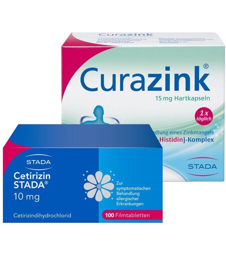 Cetirizin STADA® 10 mg Filmtabletten + Curazink® 15 mg Hartkapseln Dieses Set besteht aus: 1 x Cetirizin STADA® 10 mg Filmtabletten, 100 Stück 1 x Curazink® 15 mg Hartkapseln, 100 Stück Cetirizin STADA® 10 mg Filmtabletten Cetirizin STADA® 10 mg Filmtabletten DEN HEUSCHNUPFEN LINDERN Verstopfte Nase, juckende Augen – gerade in der Pollenflugzeit haben viele Deutsche mit Allergien zu kämpfen. In der Therapie von Allergie-Symptomen wie chronisch allergischem Schnupfen oder chronischer Nesselsucht haben sich Antiallergika bewährt. Antihistaminika wie Cetirizin STADA hindern die Wirkung von Histamin im Körper, also die Substanz, die im Körpergewebe unter anderem für die allergischen Symptome sorgt. Das schließt z.B. die geschwollene Nasenschleimhaut bei Heuschnupfen mit ein. Cetirizin STADA 10 mg ist ein schnell wirksames Antihistaminikum. Wirksam gegen Allergien, hilft es nicht nur zuverlässig, sondern auch schnell. Bereits 20 Minuten nach Einnahme der Filmtablette ist in der Regel seine antiallergische Wirkung spürbar, die sich über 24 Stunden hält. CETIRIZIN STADA® - ZUR SYMPTOMATISCHEN BEHANDLUNG ALLERGISCHER ERKRANKUNGEN WIE HEUSCHNUPFEN Antihistaminikum der 2. Generation mit dem Wirkstoff Cetirizinhydrochlorid Lindert allergische Nasen- und Augensymptome und chronische Nesselsucht Wirkt in i.d.R. bereits nach 20 Minuten! Auch als Saft oder Lutschtabletten erhältlich SO WIRKT CETIRIZIN STADA® Cetirizin STADA ist wirksam gegen Allergiesymptome wie Heuschnupfen. Das Antihistaminikum der 2. Generation hemmt die Bindung des Histamins an die H1-Rezeptoren und verhindert damit die Histaminwirkung. Somit wirkt es schnell und zuverlässig allergischen Symptomen, einschließlich geschwollener Nasenschleimhaut entgegen. Art der Anwendung: Die Einnahme ist einfach: Es ist empfohlen, 1-mal täglich eine Filmtablette einzunehmen. Nehmen Sie die Tabletten unzerkaut mit reichlich Flüssigkeit ein - vorzugsweise am Abend. Die Tabletten können mit oder ohne Nahrung eingenommen werden. Es ist möglich, die Tablette in gleiche Dosen zu teilen. Die Dauer der Einnahme richtet sich nach der Anordnung des Arztes. Wie bei allen Antihistaminika wird empfohlen, die gleichzeitige Einnahme von Alkohol zu vermeiden. Pflichttext: Cetirizin STADA 10mg Filmtabletten. Zur Anwendung bei Kindern ab 6 Jahren, Jugendlichen und Erwachsenen. Wirkstoff: Cetirizindihydrochlorid. Zur Linderung von Nasen- und Augensymptomen bei saisonaler und ganzjähriger allergischer Rhinitis oder chronischer Nesselsucht (chronische idiopathische Urtikaria). Enthält Lactose. Zu Risiken und Nebenwirkungen lesen Sie bitte die Packungsbeilage und fragen Sie Ihren Arzt oder Apotheker. STADA Consumer Health Deutschland GmbH, Stadastraße 2-18, 61118 Bad Vilbel, Stand: Juli 2020 Curazink® 15 mg HartkapselnCURAZINK® LIEFERT ÜBERZEUGENDE ARGUMENTE GEGEN ZINKMANGELZINKMANGEL AUSGLEICHEN Zink ist ein wesentliches Spurenelement im menschlichen Körper und für eine Vielzahl biologischer Vorgänge mitverantwortlich. Es ist... ...