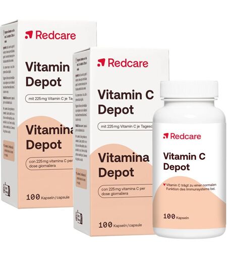 Nahrungsergänzungsmittel sind kein Ersatz für eine abwechslungsreiche und ausgewogene Ernährung und eine gesunde Lebensweise.Redcare Vitamin C DepotVitamin C ist einer der wichtigsten Mikronährstoffe im Körper. Kein Wunder, denn das Vitamin hat zahlreiche Stärken, von denen Sie täglich profitieren. Wenn Sie neben einer ausgewogenen Ernährung zusätzliches Vitamin C zu sich nehmen möchten, eignen sich die Vitamin-C-Kapseln von Redcare ideal. Im Vergleich zu herkömmlichen Präparaten punkten die Kapseln mit einer besonderen Zusammensetzung: Jede Kapsel enthält 225 mg Vitamin C Dazu Bioflavonoide aus Citrus-sinensis-Extrakt Kombiniert mit Tylopur Xtend Nutra®Der pflanzliche Inhaltsstoff Tylopur Xtend Nutra® kann zur verlängerten Freisetzung von Vitamin C beitragen. Dank der Depot-Wirkung wird der Körper so länger mit Vitamin C versorgt. Das Vitamin leistet einen Beitrag zu: … einer normalen Funktion des Immunsystems. … einem normalen Energiestoffwechsel. … einer Verringerung von Müdigkeit. … einer normalen Funktion des Nervensystems. … dem Schutz der Zellen vor oxidativem Stress.Nehmen Sie täglich eine Kapsel mit ausreichend Flüssigkeit ein. Mit Redcare Vitamin C Depot erhalten Sie eine praktische Vorratspackung mit 100 Vitamin-C-Kapseln, ausreichend für drei Monate.Zutaten: L-Ascorbinsäure, Festigungsmittel: Hydroxypropylmethylcellulose*, Überzugsmittel: Hydroxypro-pylmethylcellulose, Citrus-sinensis-Extrakt *Die Zugabe von Hydroxypropylmethylcellulose kann einen Beitrag dazu leisten, die Geschwindigkeit der Vitamin-C-Aufnahme durch den Körper zu verlangsamen.Kann Spuren von Soja, Milch und Hühnerei-Eiweiss enthalten.Nährwerte: Durchschnittliche Nährwerte 1 Kapsel** NRV*** Vitamin C 225 mg 281 % Citrus Bioflavonoide 10 mg 8,3 g Verzehrempfehlung: Täglich 1 Kapsel mit reichlich Flüssigkeit einnehmen.Hinweis:Die angegebene empfohlene tägliche Verzehrmenge darf nicht überschritten werden.Die Zugabe von Hydroxypropylmethylcellulose kann einen Beitrag dazu leisten, die Geschwindigkeit der Vitamin-C-Aufnahme durch den Körper zu verlangsamenAufbewahrungshinweis:Außerhalb der Reichweite von kleinen Kindern aufbewahren.Nettofüllmenge: 2 x 100 StückHersteller:Shop-Apotheke B.V.Erik de Rodeweg 11/135975 WD SevenumNiederlande ...