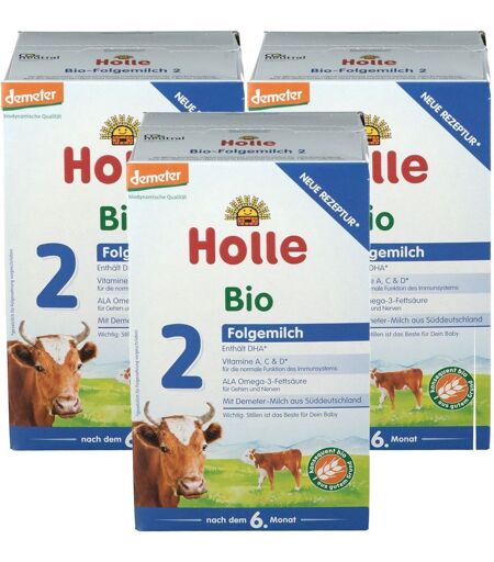 Wichtiger Hinweis: Muttermilch ist die ideale Nahrung für Säuglinge in den ersten Monaten. Sie ist gut verdaulich und so zusammengesetzt, dass sie im ersten Lebenshalbjahr den Bedarf an Nährstoffen und Flüssigkeit deckt. Bei alternativer Ernährung mit Muttermilchersatzprodukten beachten Sie die Hinweise und Zubereitungsanleitungen auf den Packungen genau, denn eine unsachgemäße Zubereitung von Säuglingsanfangsnahrung kann zu gesundheitlichen Beeinträchtigungen führen. Wir empfehlen, sich vor Anwendung von Muttermilchersatznahrung ärztlich beraten zu lassen.Bitte achten Sie auf eine abwechslungsreiche und ausgewogene Ernährung und gesunde Lebensweise. Anwendung: Im Anschluss an das Stillen, an die Holle Bio-Säuglingsmilchnahrung 1 oder anstelle jeder anderen Folgemilch verwendbar. Bestandteil einer gemischten Ernährung aus Flaschen und Breimahlzeiten. Sättigend, entspricht dem steigenden Nährstoffbedarf eines Babys. Zutaten: Entrahmte Milch**1, pflanzliche Öle* (Palmöl*3, Sonnenblumenöl*, Rapsöl*), Maltodextrin*, Molkenerzeugnis* (teilentmineralisiertes Molkenpulver), Stärke*, Magermilchpulver**, Lactose*, Fischöl2, Magermilchpulver*, Calciumcarbonat, Kaliumchlorid, Natriumchlorid, Calciumphosphat, Vitamin C, Natriumcitrat, L-Tryptophan, Eisenlactat, L-Tyrosin, Vitamin E, Zinksulfat, Vitamin A, Vitamin D, Niacin, Pantothensäure, Kupfersulfat, Vitamin K, Folsäure, Vitamin B1, Vitamin B12, Vitamin B6, Mangansulfat, Kaliumjodat, Natriumselenat, Biotin. *aus biologischer Landwirtschaft **aus biologisch-dynamischer Landwirtschaft 1 100g Säuglingsmilchpulver werden aus 196ml entrahmter Milch hergestellt 2 enthält DHA (gesetztlich für Folgenahrung vorgeschrieben) 3 aus nachhaltigem Anbau *enthält von Natur aus Zucker Nährwerttabelle pro 100g pro 100ml Trinkmenge* Energie 2.085,03 kj 498,00 kcal 291,90 kj 69,72 kcal Fett 23,80 g 3,33 g davon gesättigte Fettsäuren 8,50 g 1,19 g davon einfach ungesättigte Fettsäuren 10,50 g 1,47 g davon mehrfach ungesättigte Fettsäuren 4,80 g 0,67 g Kohlenhydrate 60,80 g 8,51 g davon Zucker 33,60 g 4,70 g Eiweiß 10,10 g 1,41 g Vitamine pro 100g pro 100ml Trinkmenge* % NRV** pro Portion Vitamin A 455,00 μg 63,70 μg 7,96 % Vitamin D 12,00 μg 1,68 μg 33,60 % Vitamin E 12,00 mg 1,68 mg 14,00 % Vitamin C 105,00 mg 14,70 mg 18,38 % Thiamin 0,45 mg 0,06 mg 5,45 % Riboflavin 1,10 mg 0,15 mg 10,71 % Niacin 3,50 mg 0,49 mg 3,06 % Vitamin B6 0,36 mg 0,05 mg 3,57 % Folsäure 144,00 μg 20,16 μg 10,08 % Vitamin B12 1,40 μg 0,20 μg 8,00 % Biotin 14,00 μg 1,96 μg 3,92 % Pantothensäure 3,50 mg 0,49 mg 8,17 % ** Prozent Nährstoffbezugswerte (NRV) laut Verordnung (EU) Nr. 1169/2011. Mineralstoffe pro 100g pro 100ml Trinkmenge* % NRV** pro Portion Kalium 564,00 mg 78,96 mg 3,95 % Kalzium 470,00 mg 65,80 mg 8,23 % Phosphor 280,00 mg 39,20 mg 5,60 % Magnesium 37,80 mg 5,29 mg 1,41 % Eisen 5,90 mg 0,83 mg 5... ...