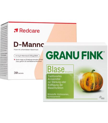 Nahrungsergänzungsmittel sind kein Ersatz für eine abwechslungsreiche und ausgewogene Ernährung und eine gesunde Lebensweise. D-MANNOSE RedCare + GRANU FINK® BLASE Set bestehend aus: D-MANNOSE RedCare 30 St. GRANU FINK® BLASE D-MANNOSE RedCare Um optimal zu funktionieren und ungebetene Gäste wie bestimmte Bakterien auszuscheiden, ist der Körper auf eine regelmäßige Flüssigkeitszufuhr angewiesen. Redcare hat mit D-Mannose ein Trinkpulver in praktischen Sachets entwickelt, welches Sie bei Ihrer Trinkroutine unterstützt und zum Wohlbefinden beiträgt: 2 g D-Mannose & 27,5 µg Biotin pro Portion Pulver mit fruchtigem Johannisbeer-Geschmack Einfache Einnahme dank dosierter Sachets Biotin leistet einen Beitrag zum Erhalt normaler Schleimhäute, beispielsweise der Blasenschleimhaut. Außerdem trägt das Vitamin zum normalen Energiestoffwechsel bei. Mannose ist daher bei Frauen beliebt. Das fruchtige Pulver ist antibiotikafrei und auch für Veganer geeignet. Sie können es zur Unterstützung regelmäßig oder bei Bedarf verwenden. Zutaten: D-Mannose (40 %), Fruktose, Reismehl (Oryza sativa), Rote-Beetewurzel-Pulver (Beta vulgaris), Säuerungsmittel: Citronensäure, Aroma, Süßungsmittel: Steviolglykoside, D-BiotinNährwerte: Durchschnittliche Nährwerte 1 Sachet D-Mannose 2 g Biotin 27,5 μg Verzehrempfehlung: Das Mannose-Pulver lässt sich dank der kleinen Sachets einfach einnehmen. Den Inhalt in 100 Milliliter Wasser einrühren und schluckweise trinken. Diese tägliche Verzehrmenge sollte nicht überschritten werden. D-Mannose von Redcare enthält 30 Sachets mit je fünf Gramm Pulver und reicht für einen Monat. Hinweis: Die empfohlene tägliche Verzehrmenge darf nicht überschritten werden. Aufbewahrung: Kühl, trocken und dunkel lagern. Außerhalb der Reichweite von kleinen Kindern aufbewahren.Nettofüllmenge: 30 Stück Hersteller: Shop-Apotheke B.V. Dirk Hartogweg 14 NL-5928 LV Venlo GRANU FINK® BLASE Eine Blasenschwäche kann zahlreiche Ursachen haben. Meist sind körperliche Gründe wie chronische Entzündungen, die hormonellen Veränderungen in der Pubertät, bei Schwangerschaft und in den Wechseljahren, sowie die gutartige Prostatavergrößerung bei Männern für die schwache Blase verantwortlich. Ständiger Harndrang, ein gestörtes Entleerungsempfinden, Schmerzen und Brennen beim Wasserlassen und ungewollter Harnabgang sind typische Beschwerden. Das pflanzliche Arzneimittel GRANU FINK® BLASE enthält die Wirkstoffe Arzneikürbissamen und Kürbissamenöl. Für die FINK® Präparate wird ausschließlich der Arzneikürbis (Curcubita pepo L.) verwendet. In dieser eigens entwickelten, streng kontrollierten Sonderzüchtung sind die arzneilich wertvollen Inhaltsstoffe in besonders hohem Maße und bei gleich bleibender Zusammensetzung enthalten. Wirkungsvolle Inhaltsstoffe sind: Delta-7-Sterole (haben eine positive Wirkung auf den urologischen Stoffwechsel) Linolsäure (harmonisiert das Zusammenspiel der Blasenwand- und Blasenverschlussmuskulatur) Bereits durch eine kurmäßige Einnahme... ...