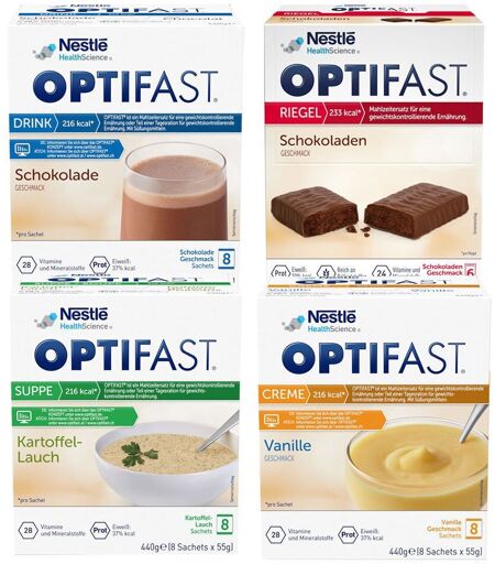 Bitte achten Sie auf eine abwechslungsreiche und ausgewogene Ernährung und gesunde Lebensweise. OPTIFAST® home Drink Schokolade + OPTIFAST® Riegel Schokolade + OPTIFAST® home Suppe Kartoffel-Lauch + OPTIFAST® home Creme Vanille Set bestehend aus: OPTIFAST® home Drink Schokolade OPTIFAST® Riegel Schokolade OPTIFAST® home Suppe Kartoffel-Lauch OPTIFAST® home Creme Vanille Zutaten: OPTIFAST® home Drink Schokolade Magermilchpulver, Milcheiweiß, Maltodextrin, pflanzliche Öle, enthalten Milcheiweiß (Raps, Sonnenblume), Ballaststoffe (Gummi arabicum, Fructo-Oligosaccharide, Inulin), Mineralstoffe (Kaliumcitrat, Magnesiumcitrat, Kaliumphosphat, Natriumchlorid, Calciumcarbonat, Eisenpyrophosphat, Zinksulfat, Kupfergluconat, Mangansulfat, Natriumfluorid, Natriumselenit, Chromchlorid, Natriummolybdat, Kaliumiodid), fettarmes Kakaopulver (4%), Fischöl (enthält Sojalecithin, Milchprotein), Aroma, Vitamine (Niacin, E, Pantothensäure, C, B6, Thiamin, Riboflavin, A, Folsäure, K, Biotin, D, B12), Süßungsmittel (Aspartam, Acesulfam K). Enthält eine Phenylalaninquelle. OPTIFAST® Riegel Schokolade Milcheiweiß (Molkenprotein-Isolat, Calciumcaseinat), Feuchthaltemittel (Sorbitol, Glycerin), Vollmilchschokolade (14,5 %) [Zucker, Kakaobutter, Vollmilchpulver, Kakaomasse, Emulgator (Sojalecithin), natürliches Vanillearoma], Ballaststoffe (Polydextrose), Mineralstoffe (Kaliumcitrat, Calciumcarbonat, Natriumcitrat, Natriumphosphat, Magnesiumcarbonat,Magnesiumphosphat, Calciumphosphat, Kupfersulfat, Eisenpyrophosphat, Kaliumiodat, Natriumselenat, Zinkoxid, Mangansulfat), fettarmes Kakaopulver (5 %), pflanzliche Öle (Raps, Distel), Fruktosesirup, Sojaprotein-Isolat, Aroma, Glukosesirup, Vitamine (C, E, Niacin, A, Pantothensäure, Biotin, B12, Folsäure, D, B6, Riboflavin, K, Thiamin), Emulgator(Sojalecithin). OPTIFAST® home Suppe Kartoffel-Lauch Milcheiweiß, Magermilchpulver, pflanzliche Öle, enthalten Milcheiweiß (Raps, Sonnenblume), getrocknetes Gemüse (8,8%) (Kartoffel, Lauch, Spinat), Ballaststoffe (Gummi arabicum, Fructo-Oligosaccharide, Inulin), Mineralstoffe (Kaliumcitrat, Magnesiumcitrat, Kaliumphosphat, Calciumcarbonat, Eisensulfat, Zinksulfat, Kupfergluconat, Mangansulfat, Natriumfluorid, Natriumselenit, Chromchlorid, Natriummolybdat, Kaliumiodid), Maltodextrin, Aroma, Fischöl (enthält Sojalecithin, Milchprotein), Geschmacksverstärker (Mononatriumglutamat), Vitamine (Niacin, E, Pantothensäure, C, B6, Thiamin, Riboflavin, A, Folsäure, K, Biotin, D, B12), getrockneter Schnittlauch, Farbstoff (Kurkumin). OPTIFAST® home Creme Vanille Zucker, Milcheiweiß, Magermilchpulver, pflanzliche Öle (Kokosnussöl, Sonnenblumenöl), modifizierte Stärke, Inulin, Glucosesirup, Kaliumcitrat, Calciumphosphat, Aroma, Trennmittel (Siliciumdioxid), Natriumcitrat, Verdickungsmittel (Carrageen), Stabilisator (Natriumphosphat), Maltodextrin, Emulgator (Sojalecithin, E322, E472b), Kaliumphosphat, Magnesiumcarbonat, Natriumchlorid, Süßstoff (Acesulfam K, Aspartam)... ...