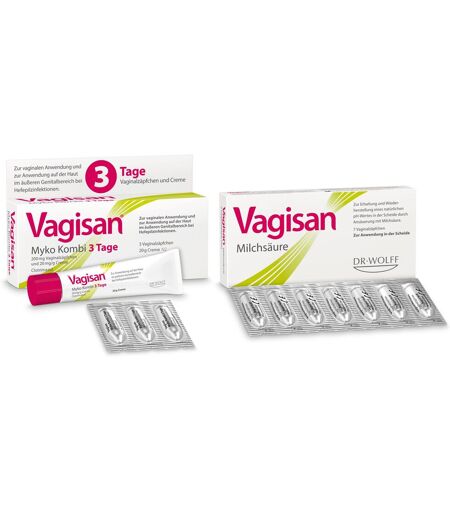 Vagisan Myko Kombi 3 Tage + Milchsäure Dieses Set besteht aus: 1 x Vagisan Myko Kombi 3 Tage, Vaginalzäpfchen + Creme 1 x Vagisan Milchsäure, 14 Zäpfchen Vagisan Myko Kombi 3 Tage Das Produkt auf einem Blick: rezeptfreies Arzneimittel gegen Scheidenpilz 3-Tage Therapie mit bewährter Anti-Pilz-Wirkung Kombination aus Zäpfchen (für die Scheide) und Creme (für den äußeren Intimbereich) cremige Zäpfchen statt trockene Tabletten, schmelzen in der Scheide, bilden eine Creme und hinterlassen keine ungelösten Rückstände Zäpfchen sind ohne Applikator einzuführen von den Vagisan Experten entwickelt Vagisan Myko Kombi 3 Tage enthält 3 Vaginalzäpfchen – keine Vaginaltabletten – mit besonderer Cremolum-Galenik zur Behandlung von Scheidenpilz. Die Kombipackung enthält außerdem eine Tube mit Creme zur Anwendung im äußeren Intimbereich. Da meist die Scheide (Vagina) und die Schamlippen von einer Hefepilzinfektion betroffen sind, sollten beide Bereiche behandelt werden. Sowohl die Zäpfchen als auch die Creme enthalten den Wirkstoff Clotrimazol mit seiner bewährten Anti-Pilz-Wirkung (antimykotische Wirkung). Ein Vaginalzäpfchen enthält 200 mg Clotrimazol, 1 g der Creme enthält 200 mg Clotrimazol. Das Zäpfchen wird einfach ohne Applikator in die Scheide eingeführt. Es schmilzt nach dem Einführen durch die Körperwärme und bildet zusammen mit der Scheidenflüssigkeit eine Creme. Diese Creme hat zusätzlich zur Anti-Pilz-Wirkung einen cremenden Effekt auf die bei Vaginalpliz oft brennende und juckende Scheidenhaut. Die Zäpfchen von Vagisan Myko Kombi schmelzen und hinterlassen keine ungelösten Rückstände in der Scheide. Führen Sie 1-mal täglich 1 Vaginalzäpfchen an 3 aufeinanderfolgenden Tagen möglichst tief in die Scheide ein. Die Anwendung sollte bevorzugt am Abend erfolgen, weil das Vaginalzäpfchen dann wirken kann, während Sie schlafen. Da das Vaginalzäpfchen in der Scheide schmilzt, ist es ratsam zur Vermeidung von Fettflecken in der Unterwäsche eine Slipeinlage zu tragen. Die Behandlung sollte zweckmäßigerweise nicht während der Menstruation durchgeführt werden bzw. vor deren Beginn abgeschlossen sein. Die Creme wird zur Behandlung des Juckreizes und der Schmerzen bei einer durch Pilze verursachten Entzündung der Schamlippen 2-mal täglich an 3 aufeinanderfolgenden Tagen dünn im äußeren Intimbereich vom Scheideneingang bis hin zum After aufgetragen und leicht eingerieben. Vagisan Myko Kombi 3 Tage ist auch als Mittel gegen Scheidenpilz während der Schwangerschaft und Stillzeit geeignet. Allerdings sollte das Arzneimittel während der Schwangerschaft und Stillzeit nur unter ärztlicher Kontrolle bzw. Anleitung angewendet werden. Im Allgemeinen ist es ausreichend, die Vaginalzäpfchen und die Creme gleichzeitig über einen Zeitraum von 3 Tagen anzuwenden. Halten Sie bitte diesen Zeitraum auch dann ein, wenn die Symptome bereits vorher abgeklungen sind. Falls erforderlich, kann eine zweite Behandlung über weitere 3 Tage durchgeführt werden. Sollte jedoch innerhalb von 3... ...