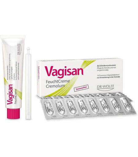 Vagisan FeuchtCreme + Vagisan FeuchtCreme Cremolum Dieses Set besteht aus: 1 x Vagisan FeuchtCreme,50 g 1 x Vagisan FeuchtCreme Cremolum, 16 Vaginalzäpfchen Vagisan FeuchtCreme Das Produkt auf einen Blick: pflegt die Scheide und hält sie geschmeidig hilfreich gegen Schmerzen beim Sex lindert Juckreiz, Brennen und Trockenheitsgefühl spendet Feuchtigkeit ohne Hormone von den Vagisan Experten entwickelt Bei der hormonfreien Vagisan FeuchtCreme handelt es sich im Unterschied zu einer rein wasserbasierten Zubereitung (die meisten Gele) um eine Creme. Die Vagisan FeuchtCreme hat neben einem hohen Wasser-Anteil auch einen pflegenden Fett-Anteil. Die weiße, geschmeidige Creme von Vagisan versorgt die trockene Vagina mit Feuchtigkeit und pflegenden Lipiden und lindert die durch Scheidentrockenheit hervorgerufenen Symptome wie z. B. Trockenheitsgefühl, Brennen, Juckreiz oder Scheidenschmerzen. Durch den Zusatz von Milchsäure ist die Feuchtcreme auf einen pH-Wert von 4,5 eingestellt - damit unterstützt Vagisan FeuchtCreme die Erhaltung eines natürlichen Säurewertes (pH Wert) in der Scheide. Diese Scheidencreme ist frei von Hormonen (Östrogenen) und kann deshalb auch zusammen mit einer systemischen Hormonersatztherapie (z. B. Tabletten, transdermale Pflaster) oder im Wechsel mit Hormon- (Östrogen-)haltigen Vaginalcremes oder -zäpfchen angewandt werden. Die FeuchtCreme ist frei von Duftstoffen. Die regelmäßige Anwendung von Vagisan FeuchtCreme kann dazu beitragen, durch vaginale Trockenheit bedingte Reizungen, Entzündungen und Schmerzen in der Scheide und im äußeren Intimbereich vorzubeugen. Vagisan FeuchtCreme kann vor dem Intimverkehr angewendet werden (als Gleitcreme), insbesondere bei Schmerzen beim Geschlechtsverkehr. Die Intimcreme beeinflusst nicht die Spermienbeweglichkeit und kann somit auch bei Kinderwunsch angewendet werden. Scheidentrockenheit betrifft vor allem Frauen in bzw. nach den Wechseljahren, aber auch jüngere Frauen können von einer trockenen Scheide betroffen sein. Oftmals ist ein Östrogenmangel (in der Menopause und danach) der Grund für eine trockene Scheide, aber auch Hormonschwankungen oder Stress können eine Ursache sein. Scheidentrockenheit macht sich häufig durch Schmerzen beim Sex bemerkbar, kann die betroffenen Frauen aber auch in alltäglichen Situationen beeinträchtigen, z. B. beim Sitzen oder Fahrradfahren. Vagisan FeuchtCreme macht die empfindliche Haut im Intimbereich angenehm geschmeidig. Das kann sich auch positiv beim Sex auswirken, insbesondere für Frauen, die ansonsten zu Schmerzen beim Intimverkehr durch eine trockene Scheide neigen. Vagisan FeuchtCreme Cremolum Vagisan FeuchtCreme Cremolum Vagisan FeuchtCreme Cremolum I weichschmelzende Zäpfchen gegen Scheidentrockenheit I lindert Brennen, Jucken und Schmerzen bedingt durch eine trockene Scheide Das Produkt auf einem Blick: pflegt die Scheide und hält sie geschmeidig hilfreich gegen Schmerzen beim Sex lindert Juckreiz, Brennen und Trockenheitsgefühl ohne Hormone... ...