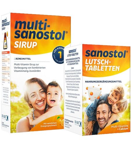 Nahrungsergänzungsmittel sind kein Ersatz für eine ausgewogene und abwechslungsreiche Ernährung und eine gesunde Lebensweise. Multi-Sanostol® Sirup + Sanostol® Lutsch-Tabletten Set bestehend aus: Multi-Sanostol® Sirup 300 g Sanostol® Lutsch-Tabletten 75 St. Multi Sanostol® Sirup Auf einen Blick Multivitaminpräparat mit leckerem Geschmack Zur Vorbeugung von kombinierten Vitaminmangelzuständen Für Kinder ab 1 Jahr Kinder haben einen bestimmten Bedarf an Vitaminen und Mineralstoffen, damit sie sich optimal entwickeln können. Gerade bei Kleinkindern gibt es immer wieder Phasen, in denen die ausreichende Versorgung nicht gegeben ist, die Kleinen keinen rechten Appetit haben oder nur einige wenige Lebensmittel essen mögen. Dadurch wird der Körper oftmals nicht ausreichend mit Nährstoffen versorgt und ein Mangel entsteht. Gerade in der kalten Jahreszeit und in den ersten Monaten der Krippen- und Kindergartenzeit kann das durchaus problematisch werden, denn dann kommen die Kleinen zum ersten Mal vermehrt mit Viren und Bakterien in Kontakt. Multi Sanostol® hilft diese Versorgungslücke zu schließen und versorgt das Kind mit wichtigen Vitaminen. Wie wirkt Multi Sanostol®? Multi Sanostol® ist das einzige Multivitaminpräparat, das als Arzneimittel für Kinder ab 1 Jahr zugelassen ist. Zum Einsatz kommt es, wenn eine ausreichende Versorgung mit Vitaminen nicht mehr gegeben ist oder ein erhöhter Bedarf besteht. Dies ist zum Beispiel während oder nach einer Erkrankung oder in Entwicklungs- und Wachstumsphasen der Fall. Pflichttext: Multi-Sanostol®, Multi-Sanostol® ohne Zuckerzusatz, Sirup Anwendungsgebiete: Multi-Sanostol® ist ein Multivitaminpräparat zur Vorbeugung von kombinierten Vitaminmangelzuständen. Sanostol® Lutsch-Tabletten Nahrungsergänzungsmittel mit Vitaminen und Calcium mit Süßungsmitteln Zutaten: Multi-Sanostol® Sirup Retinolpalmitat (Vit. A), Colecalciferol (Vit. D3 ), Thiaminchloridhydrochlorid (Ph. Eur.) (Vit. B1 ), Riboflavinphosphat-Natrium (Ph. Eur.) (Vit. B2 ), Pyridoxinhydrochlorid (Vit. B6 ), Ascorbinsäure (Vit. C), all-rac-alpha-Tocopherolacetat (Ph. Eur.) (Vit. E), Nicotinamid, Dexpanthenol. 100 ml Sirup enthalten: 13,2 mg Vitamin A (entspr. 24000 I. E.), 0,05 mg Vitamin D3 (entspr. 2000 I. E), 20 mg Vitamin B1 , 20 mg Vitamin B2 , 10 mg Vitamin B6 , 1000 mg Vitamin C, 20 mg Vitamin E, 100 mg Nicotinamid, 40mg Dexpanthenol. Die sonstigen Bestandteile sind: Natriumbenzoat, Sorbinsäure, Calciumgluconat, Calciumphospholactat, Sucrose (Saccharose), Glucose-Sirup, Zitronensäure, Agar, Tragant, Malzextrakt (aus Gerste), Polysorbat 80, D-Glucarsäure Calciumsalz, Süßorangenschalenöl, Grapefruitsaftkonzentrat, Apfelsinensaftkonzentrat, Sonnenblumenöl, all-rac-alpha-Tocopherol, gereinigtes Wasser. Sanostol® Lutsch-Tabletten Süßungsmittel Sorbit; Calciumcarbonat; Säuerungsmittel Citronensäure; Natriumhydrogencarbonat; L-Ascorbinsäure; Retinylacetat; Thiaminmononitrat; Riboflavin; Pyridoxinhydrochlorid; Cyanocobalamin; Cholecalciferol; D... ...