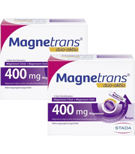 Nahrungsergänzungsmittel sind kein Ersatz für eine abwechslungsreiche und ausgewogene Ernährung und eine gesunde Lebensweise. SCHNELL UND DIREKT VERSORGT MIT DER 2-FACH KOMBINATION AUS MAGNESIUM-CITRAT und -OXID Ideal für unterwegs: Magnetrans® duo-aktiv Direktgranulat liefert 400 mg Magnesium pro Stick. Überall und leicht zu schlucken als 2-fach Kombination aus: 100mg Magnesium aus organischem Magnesiumcitrat und 300 mg Magnesium aus Magnesiumoxid. GUT ZU WISSEN: Ideal für Unterwegs: Die Sticks können ohne Flüssigkeit eingenommen werden Magnesium wird für über 300 Körperfunktionen benötigt - aber der Körper kann es selbst nicht herstellen: Magnesiumpräparate von Magnetrans® helfen, zu einem ausgeglichenen Magnesiumhaushalt beizutragen für Veganer geeignet, frei von Laktose und Gluten ANWENDUNGSEMPFEHLUNG: Erwachsene und Jugendliche ab 12 Jahren: 1 x täglich den Inhalt eines Sticks ohne Flüssigkeit verzehren. Dazu das Magnesiumgranulat direkt auf die Zunge geben, es hat einen angenehmen Geschmack und löst sich schnell auf. Die Menge eines Sticks kann auf zwei Portionen täglich aufgeteilt werden. HÄUFIGE FRAGEN & ANTWORTEN Welchen Einfluss hat Magnesium auf Ihr Wohlbefinden? Magnesium trägt zur normalen Funktion des Nervensystems und zur normalen psychischen Funktion bei. Außerdem trägt Magnesium zur Verringerung von Müdigkeit und Ermüdung bei. Zudem unterstützt Magnesium die normale Muskelfunktion, den normalen Energiestoffwechsel und spielt für das Elektrolytgleichgewicht eine Rolle. Weiterhin trägt Magnesium zum Erhalt normaler Knochen bei. Tipps zur Einnahme: Magnesiumgranulat Ein Magnetrans® duo-aktiv 400 mg Stick kann auf zwei Portionen täglich aufgeteilt werden. Dazu das Magnesiumgranulat direkt auf die Zunge geben. Zutaten: Magnesiumhydrogencitrat, Füllstoff Sorbit, Magnesiumoxid, Aromen, Trennmittel Magnesiumsalze der Speisefettsäuren, Süßungsmittel Sucralose Nährstoff Pro 1 Stick (3 g) Mangesium - davon Magnesiumcitrat - davon Magnesiumoxid 400 mg 100 mg 300 mg *Referenzmenge nach Lebensmittelinformationsverordnung.Verzehrempfehlung: Erwachsene und Jugendliche ab 12 Jahren: 1 x täglich den Inhalt eines Sticks ohne Flüssigkeit verzehren. Dazu das Magnesiumgranulat direkt auf die Zunge geben, es hat einen angenehmen Geschmack und löst sich schnell auf. Die Menge eines Sticks kann auf zwei Portionen täglich aufgeteilt werden. Tipps zur Einnahme: Ein Magnetrans® duo-aktiv 400 mg Stick kann auf zwei Portionen täglich aufgeteilt werden. Dazu das Magnesiumgranulat direkt auf die Zunge geben. Hinweis: Die täglich empfohlene Verzehrmenge darf nicht überschritten werden. Magnesium kann bei übermäßigem Verzehr abführend wirken.Lagerungshinweis: Außerhalb der Reichweite von kleinen Kindern aufbewahren. Kühl, trocken und lichtgeschützt aufbewahren.Nettofüllmenge: 2 x 50 SticksHerstellerdaten: STADA Consumer Health Deutschland GmbH Stadastraße 2-18 61118 Bad Vilbel ...