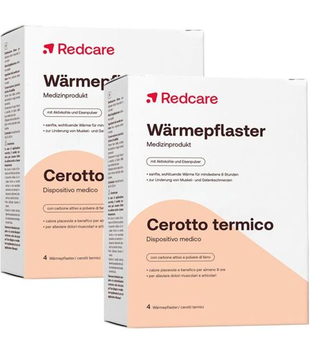 RedCare Wärmepflaster Muskelschmerzen und Verspannungen können viele Ursachen haben: Stress, einseitige Bewegung oder falsche Belastung. In jedem Fall sind sie unangenehm und können Sie im Alltag einschränken. Die RedCare Wärmepflaster sind ideal für die gezielte Schmerzlinderung der strapazierten Partien im Schulter- und Rückenbereich. Im Falle von Verspannungen und Verkrampfungen sorgt Wärme für eine bessere Durchblutung und lockert so den verhärteten Bereich. Die Mischung aus Aktivkohle und Eisen erwärmt sich beim Kontakt mit Sauerstoff, sodass die Pflaster rein physikalisch, d.h. ohne Arzneistoffe, wirken. Außerdem sind sie besonders hautfreundlich, geruchsfrei und können im Alltag bequem unter der Kleidung getragen und nach dem Gebrauch leicht entfernt werden. Die Anwendung ist ganz einfach: Das Päckchen mit der Hand öffnen (nicht einschneiden) und das Wärmepflaster entnehmen. Nach dem Öffnen des Beutels wird das Wärmepflaster innerhalb von einer Minute aktiviert und innerhalb von fünf Minuten erwärmt. Die Schutzfolie von der Rückseite des Pflasters abziehen. Das Wärmepflaster mit der Klebeseite auf die trockene, saubere Haut über der schmerzenden Stelle anbringen. Für eine optimale Haftung das Pflaster fest andrücken, insbesondere an allen Ecken und Seiten. Nach dem Gebrauch das Wärmepflaster langsam abziehen. Sanfte, wohltuende Wärme für mindestens 8 Stunden. Hinweis: Um eine Luftzirkulation zu ermöglichen, keine enganliegende Kleidung über dem Pflaster tragen. Das RedCare Wärmepflaster nicht während des Schlafens und nicht an anderen Körperstellen als dem Rücken- und Schulterbereich verwenden. Inhaltsstoffe des Wärmepflasters: Eisen, Aktivkohle und Wasser ...