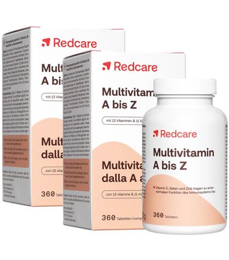 Nahrungsergänzungsmittel sind kein Ersatz für eine ausgewogene, abwechslungsreiche Ernährung und eine gesunde Lebensweise.Redcare Multivitamin A bis ZRund um die Uhr arbeitet das Immunsystem als wichtigster Schutzmechanismus des Körpers. Daher ist es auch für Ihr körperliches Wohlbefinden von entscheidender Bedeutung. Damit es gut funktioniert, braucht es eine ausgewogene Ernährung und genügend Nährstoffe. Mit Redcare Multivitamin A bis Z können Sie Ihre Versorgung unterstützen. Die Tabletten enthalten 13 Vitamine (Vitamin-B-Komplex sowie Vitamin A, C, D, E und K), 11 Mineralstoffe (Calcium, Chrom, Eisen, Magnesium, Jod, Kupfer, Mangan, Molybdän, Phosphor, Selen und Zink) sowie den sekundären Pflanzenstoff Lutein:Die Nährstoff-Kombi erfüllt verschiedene Funktionen im Körper: Vitamin B1, B2, B3, B5, B6 und B12 sowie Vitamin C, Biotin, Calcium, Eisen, Jod, Kupfer, Magnesium, Mangan und Phosphor leisten einen Beitrag zum normalen Energiestoffwechsel. Vitamin C, Selen und Zink tragen zur normalen Funktion des Immunsystems bei. Eisen, Jod und Zink leisten einen Beitrag zur normalen kognitiven Funktion. Vitamin D, Calcium und Magnesium tragen zur normalen Muskelfunktion bei. Vitamin D und K sowie Calcium, Magnesium, Mangan, Phosphor und Zink leisten einen Beitrag zum Erhalt normaler Knochen.Die Tabletten sind für Vegetarier geeignet und ideal, um die tägliche Ernährung zu ergänzen. Nehmen Sie täglich zwei Tabletten mit ausreichend Flüssigkeit zu einer Mahlzeit ein. Tipp: Nicht zusammen mit Tee, Kaffee oder Milch einnehmen. Darauf verzichten müssen Sie jedoch nicht. Einfach eine halbe Stunde Abstand zwischen der Einnahme und diesen Getränken einhalten. Die Vorratspackung enthält 360 Tabletten für ein halbes Jahr. So können Sie Ihren Körper optimal unterstützen. Zutaten:Calciumsalze der Orthophosphorsäure, Füllstoff: Mikrokristalline Cellulose, Magnesiumoxid, L-Ascorbinsäure, DL-alpha-Tocopherylacetat, Nicotinamid, Trennmittel:Magnesiumsalze der Speisefettsäuren, Eisenfumarat, Natriummolybdat (Molybdän (VI)), Farbstoff: Carotin, Trennmittel: Siliciumdioxid, Calcium-D-pantothenat, Natriumselenit, Zinkoxid, Mangansulfat, Retinylacetat, Lutein, Cyanocobalamin, Pyridoxinhydrochlorid, Cholecalciferol, Kupfersulfat,Thiaminhydrochlorid, Riboflavin, Phyllochinon, Pteroylmonoglutaminsäure, Chrom (III)-chlorid, Kaliumiodid, D-BiotinNährwerte: Durchschnittliche Nährwerte: pro 2 Tabletten* NRV** Vitamin A 801 µg 100 % Thiamin 1,4 mg 127 % Riboflavin 1,8 mg 129 % Niacin 20 mg 125 % Pantothensäure 7,5 mg 125 % Vitamin B6 2 mg 143 % Biotin 63 µg 126 % Folsäure 200 µg 100 % Vitamin B12 2,5 µg 100 % Vitamin C 100 mg 125 % Vitamin D 5 µg 100 % Vitamin E 15 mg 125 % Vitamin K 30 µg 40 % Calcium 162 mg 20 % Chrom 40 µg 100 % Eisen 5 mg 36 % Jod 100 µg 67 % Kupfer 0,5 mg 50 % Magnesium 100 mg 27 % Mangan 2 mg 100 % Molybdän 50 µg 100 % Phosphor 124 mg 18 % Selen 30 µg 55 % Zink 5 mg 50 % Lutein 0,5 mg - *angegebene tägliche Verzehrmenge ** Anteil an der... ...