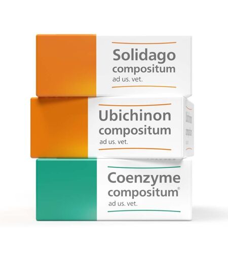 Solidago compositum ad us. vet. Ampullen + Ubichinon compositum ad us. vet. Ampullen + Coenzyme compositum® ad us. vet. Set bestehend aus : Solidago compositum ad us. vet. Ampullen Ubichinon compositum ad us. vet. Ampullen Coenzyme compositum® ad us. vet. Solidago compositum ad us. vet. Ampullen Tiere im Alter: Gesundheit fördern, Lebensqualität erhalten. Dank guter Fütterung und Pflege werden unsere Haustiere heute immer älter. Wie bei uns Menschen geht das Alter aber auch an den Vierbeinern nicht spurlos vorüber: Typische Alterserscheinungen“ wie ein erhöhtes Ruhebedürfnis, aber auch chronische Erkrankungen können die Lebensqualität betagter Tiere teilweise stark einschränken. Zwar lassen sich altersbedingte Leiden nicht gänzlich verhindern, regelmäßige Check-ups beim Tierarzt helfen aber dabei, Erkrankungen frühzeitig zu erkennen und zu behandeln. Dadurch können Sie als Halter das Wohlbefinden Ihres Tieres entscheidend fördern. Biologische Tierarzneimittel können dabei den Gesundheitszustand und die Lebensqualität gut unterstützen. Biologische Tiermedizin: wirksam und gut verträglich Die biologischen Tierarzneimittel von Heel bestehen aus mehreren effektiven Einzelsubstanzen (multicomponent) und wirken gleichzeitig an zahlreichen Stellen des Körpers (multitarget), um die Ursachen einer Erkrankung nachhaltig anzugehen. Anstelle der Verabreichung einer Vielzahl verschiedener Einzelmedikamente lassen sich mit Heel Tierarzneimitteln auch komplexe Erkrankungen nebenwirkungsarm und entsprechend den natürlichen Prozessen im Körper behandeln. Gut zu wissen Die Abkürzung ad us. vet. steht für ad usum veterinarium“, kommt aus dem Lateinischen und bedeutet zum tierarzneilichen Gebrauch“. Diese Arzneimittel sind speziell für Tiere registriert. Tierhalter finden in den Beipackzetteln die für verschiedene Tierarten angepassten Dosierungshinweise. Biologische Tierarzneimittel zeichnen sich durch ihre gute Verträglichkeit aus, sind dadurch auch zur langfristigen Gabe geeignet und können je nach Erkrankung entweder einzeln oder in Kombination mit anderen Medikamenten verabreicht werden. Mehrere effektive Einzelsubstanzen (multicomponent)… …wirken an zahlreichen Stellen des Körpers (multitarget) Gut verträglich Nebenwirkungsarm Mit anderen Arzneimitteln kombinierbar Ubichinon compositum ad us. vet. Ampullen Tiere im Alter: Gesundheit fördern, Lebensqualität erhalten. Dank guter Fütterung und Pflege werden unsere Haustiere heute immer älter. Wie bei uns Menschen geht das Alter aber auch an den Vierbeinern nicht spurlos vorüber: Typische Alterserscheinungen“ wie ein erhöhtes Ruhebedürfnis, aber auch chronische Erkrankungen können die Lebensqualität betagter Tiere teilweise stark einschränken. Zwar lassen sich altersbedingte Leiden nicht gänzlich verhindern, regelmäßige Check-ups beim Tierarzt helfen aber dabei, Erkrankungen frühzeitig zu erkennen und zu behandeln. Dadurch können Sie als Halter das Wohlbefinden Ihres Tieres entscheidend fördern. Biologische... ...