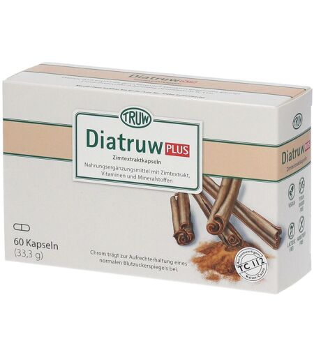 Nahrungsergänzungsmittel sind kein Ersatz für eine ausgewogene, abwechslungsreiche Ernährung und eine gesunde Lebensweise. Es wurde festgestellt, dass der regelmäßige Verzehr von Cassia-Zimt den Zuckerstoffwechsel günstig beeinflussen kann. Die Wissenschaftliche Forschung hat gezeigt, dass die wasserlöslichen Polyphenole mit den Rezeptoren der Körperzellen in Wechselwirkung treten und deren Empfindlichkeit für Insulinreize erhöhen. Vitamin C und E sowie Zink tragen dazu bei, die Zellen vor oxidativem Stress zu schützen. Zink trägt zu einem normalen Kohlenhydrat-Stoffwechsel bei. Chrom trägt zur Aufrechterhaltung eines normalen Blutzuckerspiegels bei. Zimtextraktkapseln + Vitamin C und E sowie den Mineralstoffen Zink und Chrom Es wurde festgestellt, dass der regelmäßige Verzehr von Cassia-Zimt (chinesischem Zimt) im Rahmen diätetischer Maßnahmen (Diätplan) den Zuckerstoffwechsel günstig beeinflussen kann. Mit Hilfe eines schonenden standardisierten Verfahrens wird aus der Rinde des Cassia-Zimtbaums der wässrige Spezialextrakt TC 112 hergestellt, der in immer gleich bleibender Qualität in Diabetruw PLUS Zimtkapseln enthalten ist. Der Spezialextrakt TC 112 hat den Vorteil, dass die ätherischen Öle aus dem Zimtpulver, welche Allergien und Magen-Darm-Probleme auslösen können, entfernt sind. Durch die wässrige Extraktion des Cassia-Zimt wird ebenfalls das natürlicherweise enthaltene Cumarin weitgehend entfernt, sodass der Spezialextrakt TC 112 hinsichtlich Cumarin als unproblematisch eingestuft ist. Deshalb ist er auch bei dauerhaftem Verzehr gut bekömmlich.Zudem enthalten Diabetruw PLUS Zimtkapseln eine Kombination der Vitamine C und E. Dieses Vitamin-Duo hat antioxidative Eigenschaften und wirkt freien Radikalen entgegen und kann so die Vitalität des Blutgefäßsystems unterstützen.Zink und Chrom sind physiologisch wirksame Mineralstoffein Diabetruw PLUS Zimtkapseln. Zink ist nicht nur an der Insulinspeicherung beteiligt, sondern ist auch in die Stärkung des Immunsystems eingebunden. Chrom erhöht die Wirkung des Insulins und hilft Blutzuckerspitzen nach dem Essen zu reduzieren. Hier wird vermutet, dass der Kontakt von Insulin zu den Bindungsstellen für Insulin an den Körperzellen verbessert wird. Zink und Chrom haben also einen positiven Einfluss auf den Blutzuckerspiegel und können sich somit positiv auf den Allgemeinzustand des Diabetikers auswirken.Durch den regelmäßigen Verzehr von Diabetruw PLUS Zimtkapseln als diätetisches Lebensmittel kann im Rahmen eines Diätplans der Zuckerstoffwechsel günstig beeinflusst werden. Die Kapselhüllen bestehen aus dem Naturstoff Cellulose und enthalten keine Gelatine.Zutaten: Füllstoff: mikrokristalline Cellulose; Überzugsmittel: Hydroxypropylmethylcellulose; Vitamin C, Cassia-Zimtrinde (15,1 %), Zinkgluconat, Vitamin E, Trennmittel: Siliciumdioxid, Talkum und Magnesiumsalze der Speisefettsäuren; Chrom(III)-chlorid Lactosefrei, Gelatinefrei, frei und VeganNährwerte: Durchschnittliche Nährwerte: pro Kapsel pro... ...