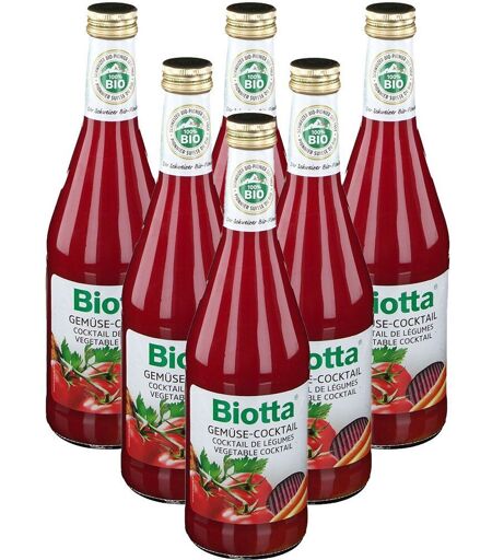 Bitte achten Sie auf eine abwechslungsreiche und ausgewogene Ernährung und gesunde Lebensweise.Zutaten: Tomatensaft*, Karottensaft milchsauer vergoren*, Selleriesaft milchsauer vergoren*, Randensaft milchsauer vergoren*, Meersalz (0.5%), Gewürzkräuter*, Pasteurisiert*aus biologischem AnbauNährwerte: Nährwerte pro 100 ml Energie 100 kJ / 23 kcal Fett 0 g Kohlenhydrate 5 g -davon Zucker 4,5 g Eiweiß 0,8 g Salz 0,5 g Kalium 310 mg Vitamin A 200 µg Verzehrempfehlung: Vor Gebrauch gut schütteln. Nach dem Öffnen im Kühlschranklagern. Innerhalb von 8 Tagen trinken.Hinweis: Die angegebene empfohlene tägliche Verzehrmenge darf nicht überschritten werden.Aufbewahrung: Kühl (6-25 °C) und lichtgeschützt lagern. Außerhalb der Reichweite von kleinen Kindern aufbewahren.Nettofüllmenge: 6 x 500 ml SaftHerstellerdaten: Biotta AG Pflanzbergstrasse 8 CH-8274 Tägerwilen ...
