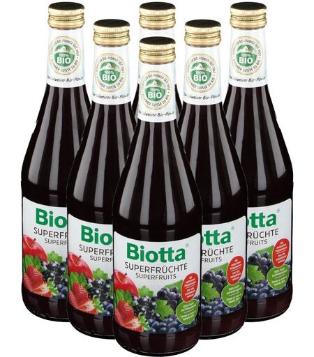 Bitte achten Sie auf eine abwechslungsreiche und ausgewogene Ernährung und gesunde Lebensweise.Zutaten:roter Bio-Traubensaft, Bio-Aroniasaft, Bio-Erdbeerpüree, Bio-Apfelsaft, Bio-Schwarzkarottensaft, Bio-Heidelbeersaft, Bio-Cassissaft und Bio-Zitronensaft.Nährwerte: Nährwerte pro 100 ml Energie 280 kJ / 66 kcal Fett 0 g -davon gesättigte Fettsäuren 0 g Kohlenhydrate 16 g -davon Zucker 13 g Eiweiß 0,5 g Salz 0,04 g Verzehrempfehlung: Gekühlt geniessen.Hinweis: Die angegebene empfohlene tägliche Verzehrmenge darf nicht überschritten werden.Aufbewahrung: Kühl (6-25 °C) und lichtgeschützt lagern. Außerhalb der Reichweite von Kindern aufbewahren.Nettofüllmenge: 6 x 500 ml Hersteller: Biotta AG Pflanzbergstrasse 8CH-8274 Tägerwilen ...