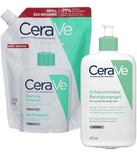 CeraVe Schäumendes Reinigungsgel + CeraVe Schäumendes Reinigungsgel Nachfüllpack Im Set enthalten: CeraVe Schäumendes Reinigungsgel CeraVe Schäumendes Reinigungsgel Nachfüllpack Pflegendes und feuchtigkeitsspendendes Reinigungsgel von CeraVe CeraVe Schäumendes Reinigungsgel pflegt und reinigt fettige Haut mit einem milden Reinigungsschaum, der überschüssigen Talg entfernt. Das Reinigungsgel für fettige Haut pflegt bereits während der Gesichtsreinigung. Dank seiner Aktiv-Wirkstoffe befreit es die Haut gründlich von überschüssigem Talg, Schmutz und Make-up, ohne dabei die natürliche Schutzbarriere der Haut anzugreifen oder die Haut auszutrocknen. Formel und Textur Die essenziellen Ceramide 1, 3 und 6-II stärken die Hautschutzbarriere, Hyaluron spendet wertvolle Feuchtigkeit und Niacinamid wirkt dank seiner antibakteriellen Eigenschaft Entzündungen entgegen. Das besonders sanft formulierte CeraVe Reinigungsgel ist nicht-komedogen und verzichtet auf Duftstoffe. Besondere Eigenschaften des schäumenden Reinigungsgels von CeraVe: Die parfumfreie Reinigung befreit die Haut effektiv von überschüssigem Fett, Schmutz und Make-up Drei essenzielle Ceramide tragen zur Erhaltung und Stärkung der natürlichen Hautschutzbarriere bei Niacinamid reguliert den Fettgehalt der Haut und Hyaluron wirkt einem Austrocknen der Haut entgegen Anwendung: Das schäumende Reinigungsgel von CeraVe am Morgen und/oder am Abend in der Hand mit etwas Wasser aufschäumen, auf der Haut verteilen und sanft einmassieren. Anschließend sorgfältig mit lauwarmem Wasser abspülen. Dank seiner sanften Formel eignet sich das Reinigungsgel auch für die tägliche Anwendung unter der Dusche. CeraVe – mit der Expertise führender Dermatologen entwickelt 2005 forschten führende Dermatologen aus den USA nach einer Hautpflege, die die Hautschutzbarriere stärkt sowie dermatologische Wirksamkeit vereint. So entstand CeraVe. Zusammensetzung Aqua / Water • Cocamidopropyl Hydroxysultaine • Glycerin • Sodium Lauroyl Sarcosinate • Propanediol • Peg-150 Pentaerythrityl Tetrastearate • Niacinamide • Peg-6 Caprylic/Capric Glycerides • Ceramide Np • Ceramide Ap • Ceramide Eop • Carbomer • Sodium Methyl Cocoyl Taurate • Sodium Benzoate • Sodium Chloride • Sodium Lauroyl Lactylate • Sodium Hyaluronate • Cholesterol • Phenoxyethanol • Disodium Edta • Citric Acid • Tetrasodium Edta • Phytosphingosine • Xanthan Gum • Ethylhexylglycerin Hersteller: 62, Quai Charles Pasqua 92300 Levallois-Perret France fragen@loreal-group.com ...